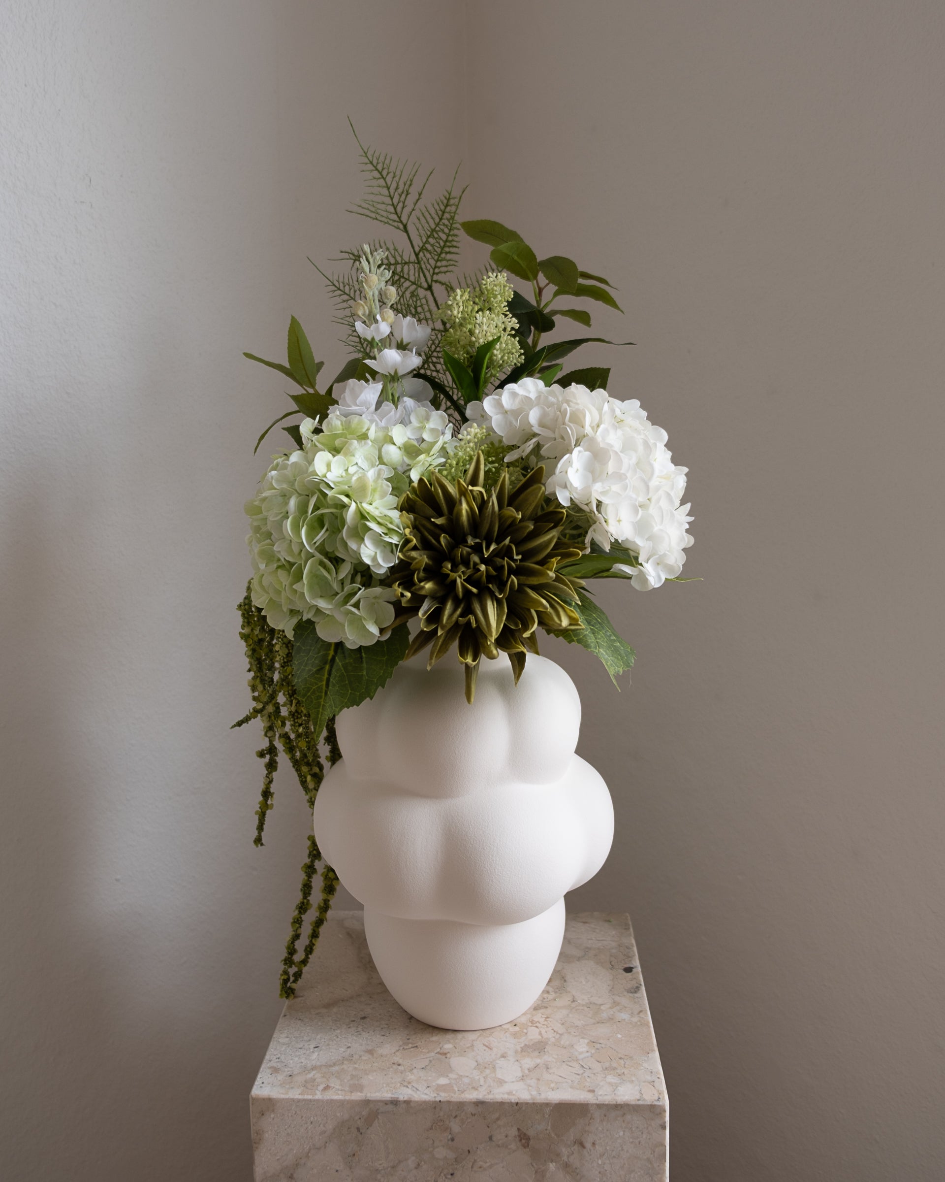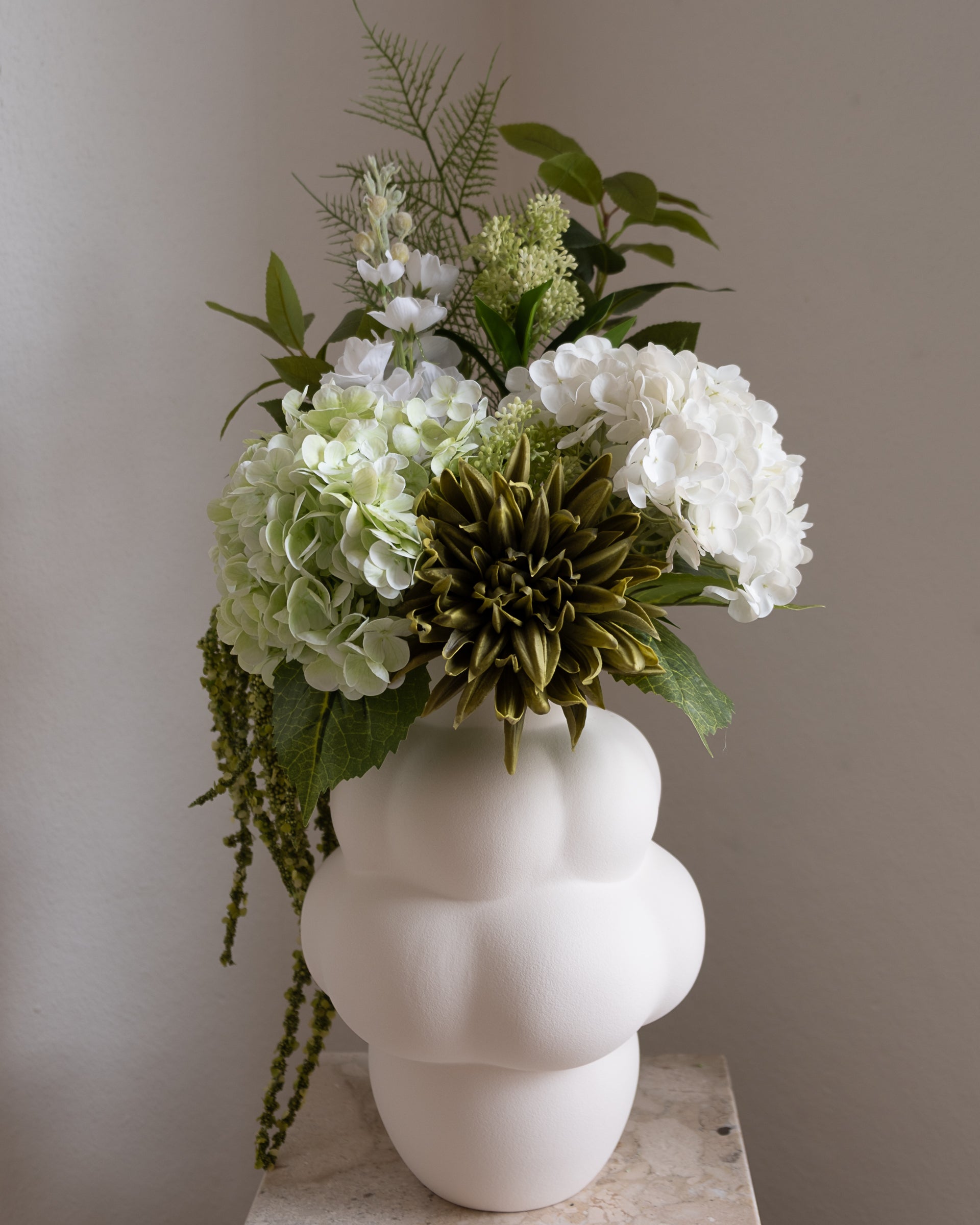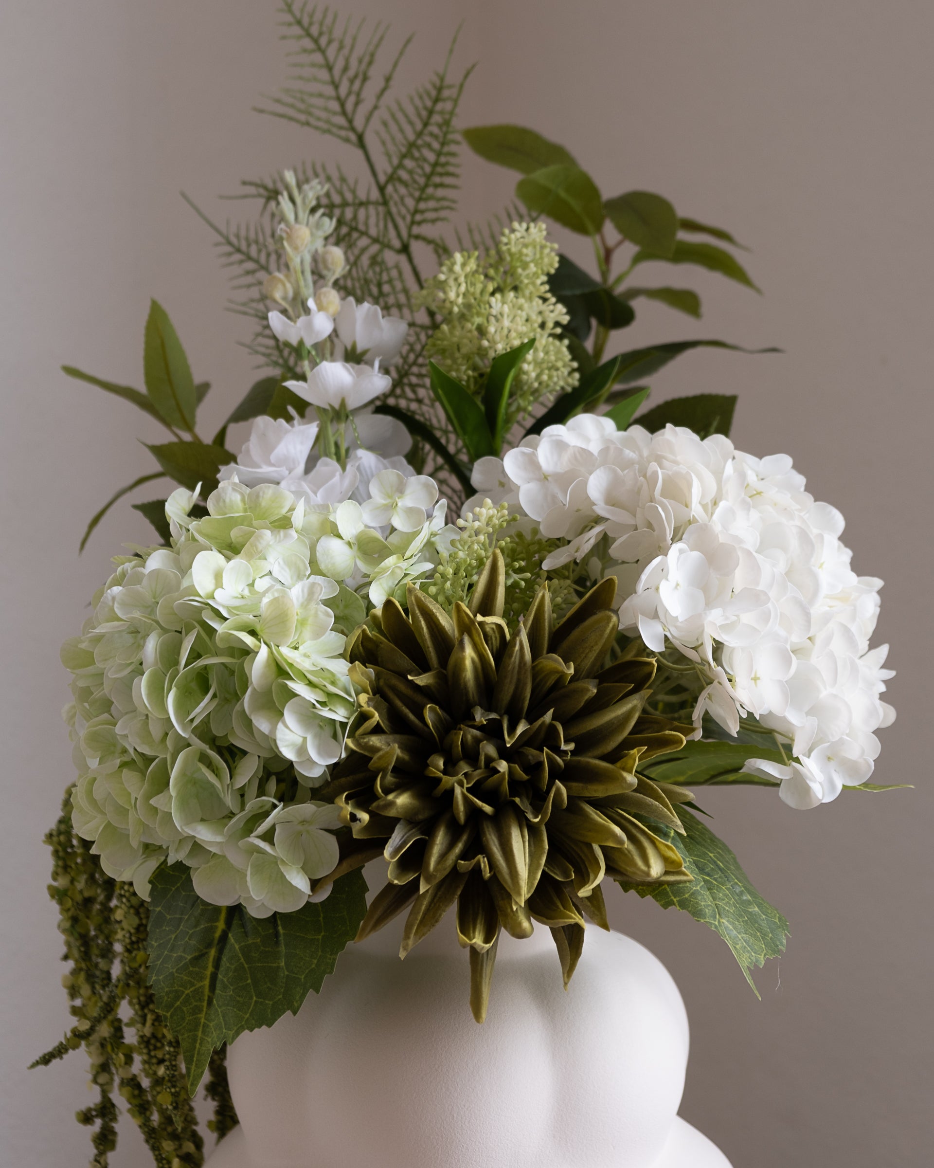 En fantastisk kunstig bukett med en balansert blanding av myke hvite og grønne toner. Denne buketten fanger tidløs skjønnhet og gir en rolig og forfriskende atmosfære til ethvert rom. Laget av kunstige blomster av høy kvalitet, gir Ivory Grove varig skjønnhet med minimalt vedlikehold, perfekt dekor hele året.