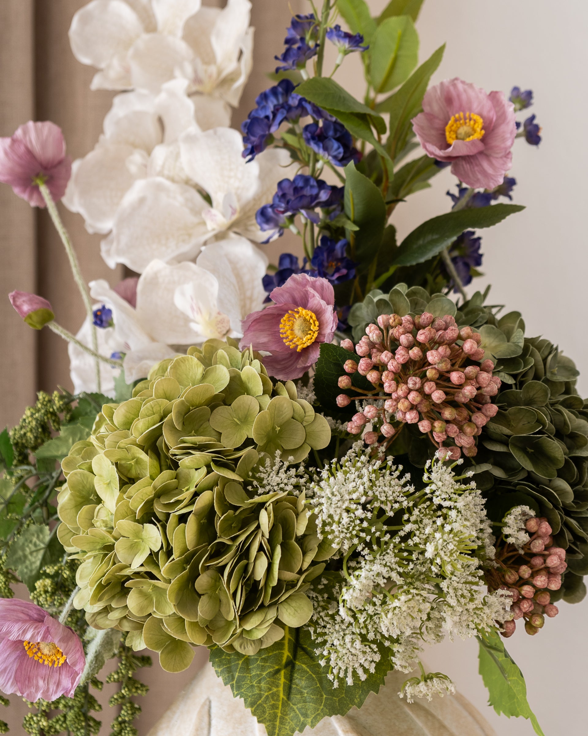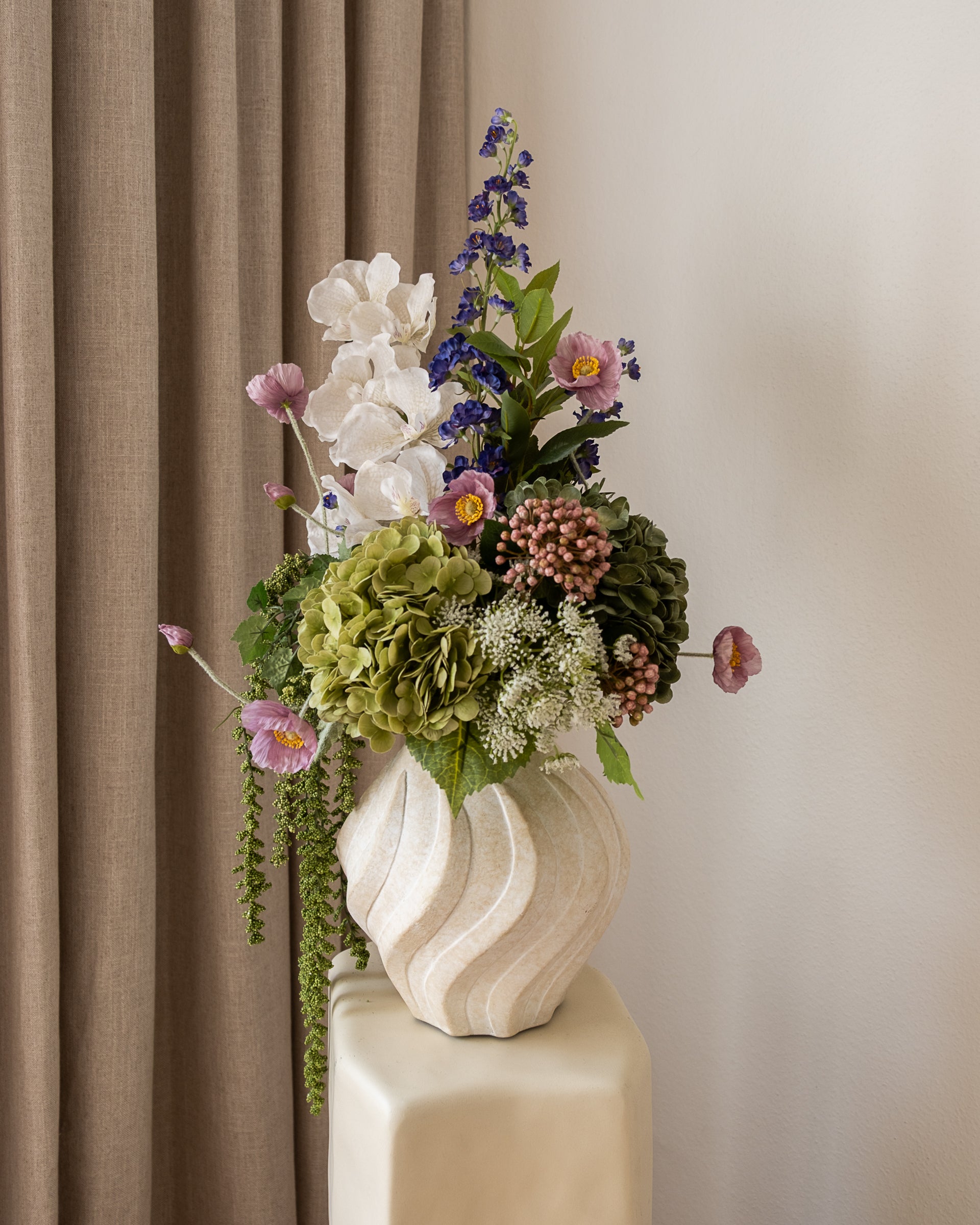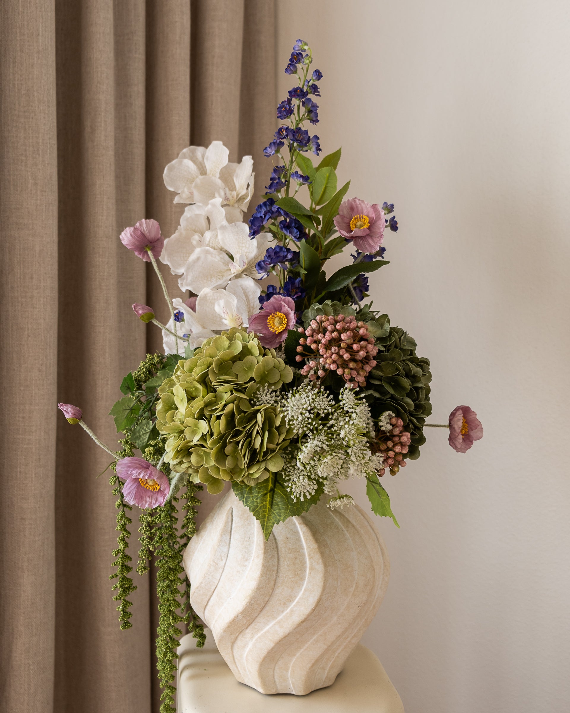 En kunstig høstbukett som kombinerer lilla, grønt og myke kontraster. Realistiske blomster som gir friskhet og ro – en moderne tolkning av høstfarger.
