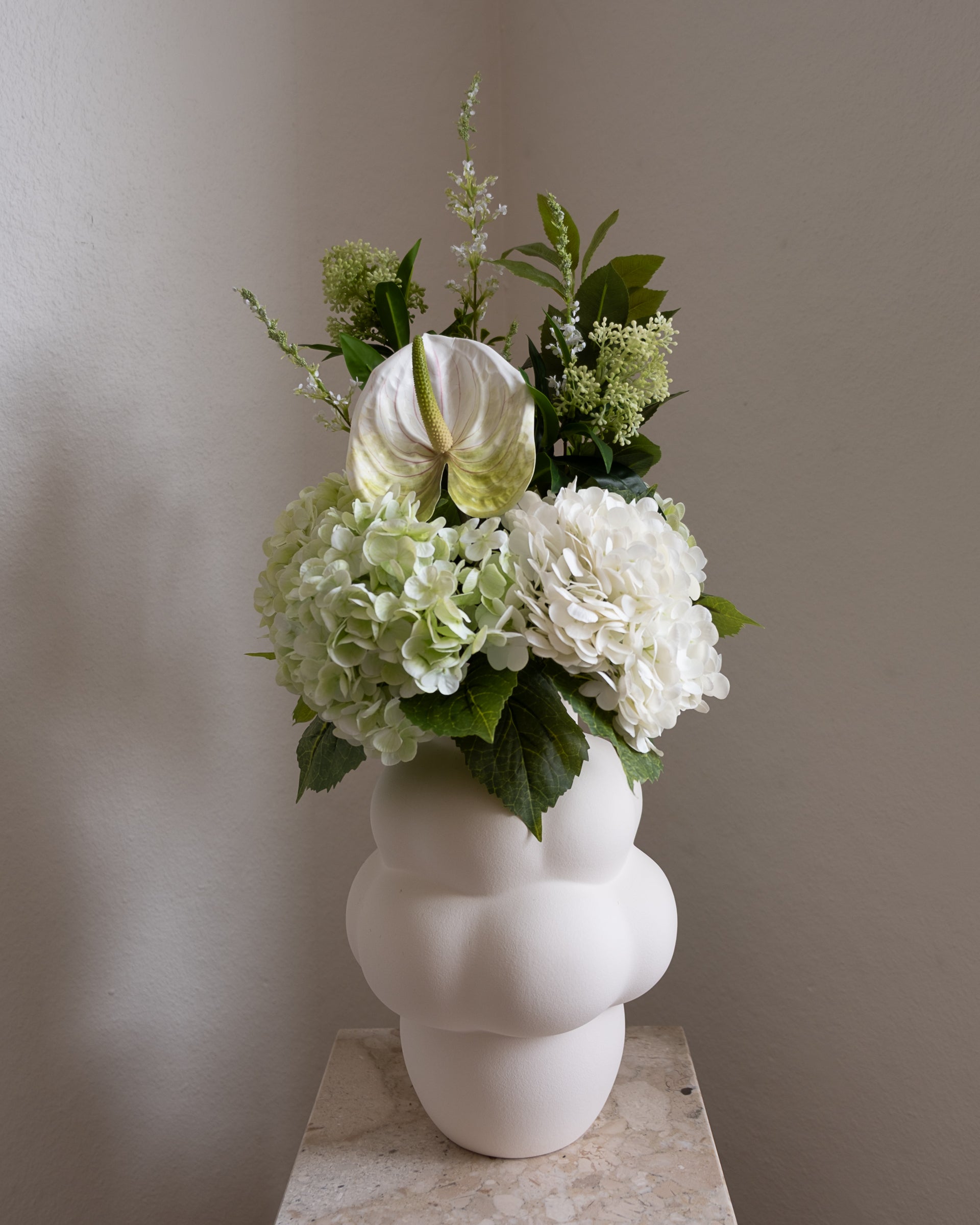 Bring et friskt preg av naturen inn i hjemmet ditt med Soft Whisper Bouquet, en elegant kunstig blomsterbukett i beroligende lyse grønne og hvite toner. Denne delikate buketten fremkaller naturens fredelige skjønnhet, og skaper en rolig og avslappende atmosfære i ethvert rom. Laget av kunstige blomster av høy kvalitet, gir Soft Whisper varig skjønnhet med minimalt vedlikehold, enten du ønsker å friske opp rommet for våren eller tilføre tidløs eleganse året rundt.