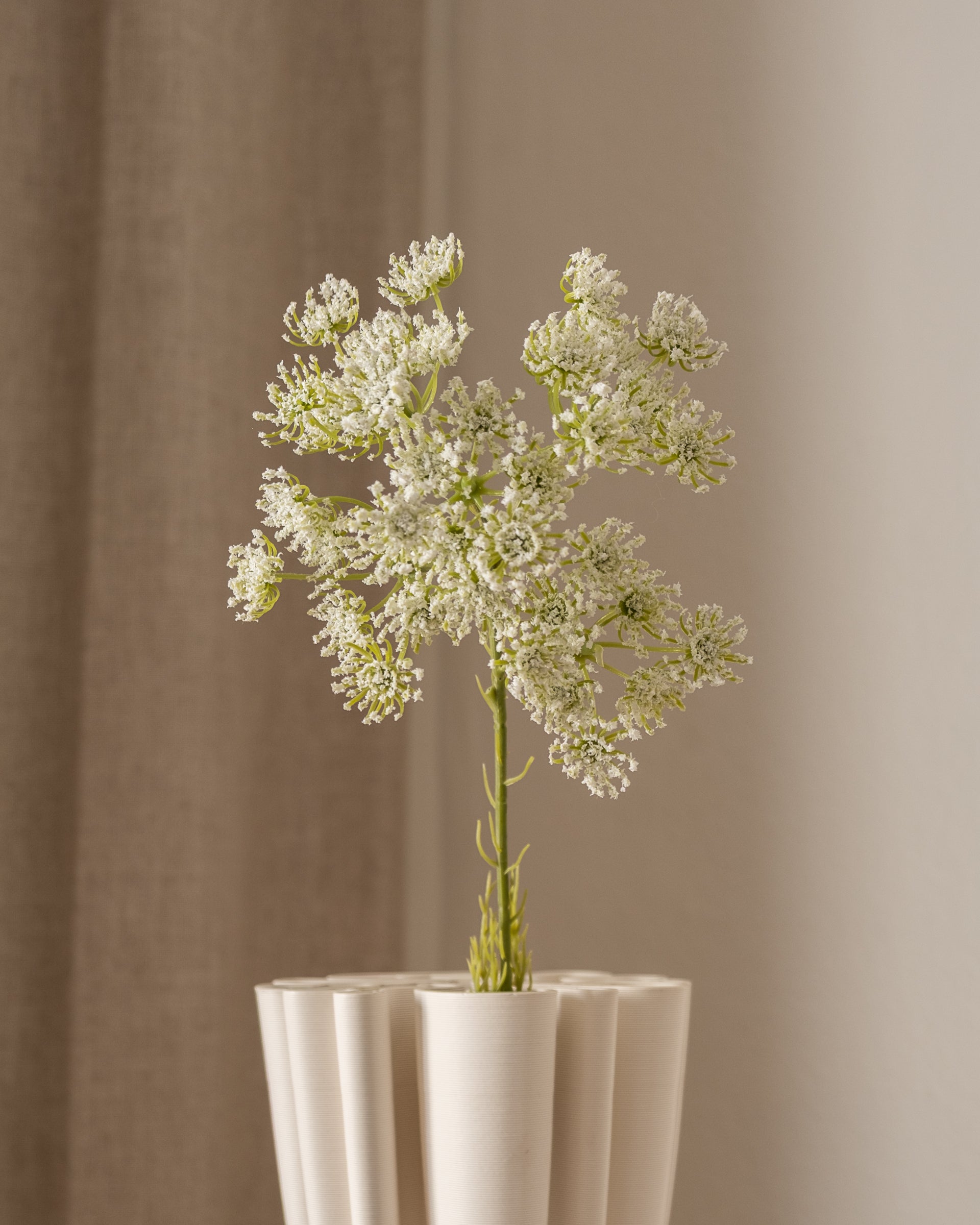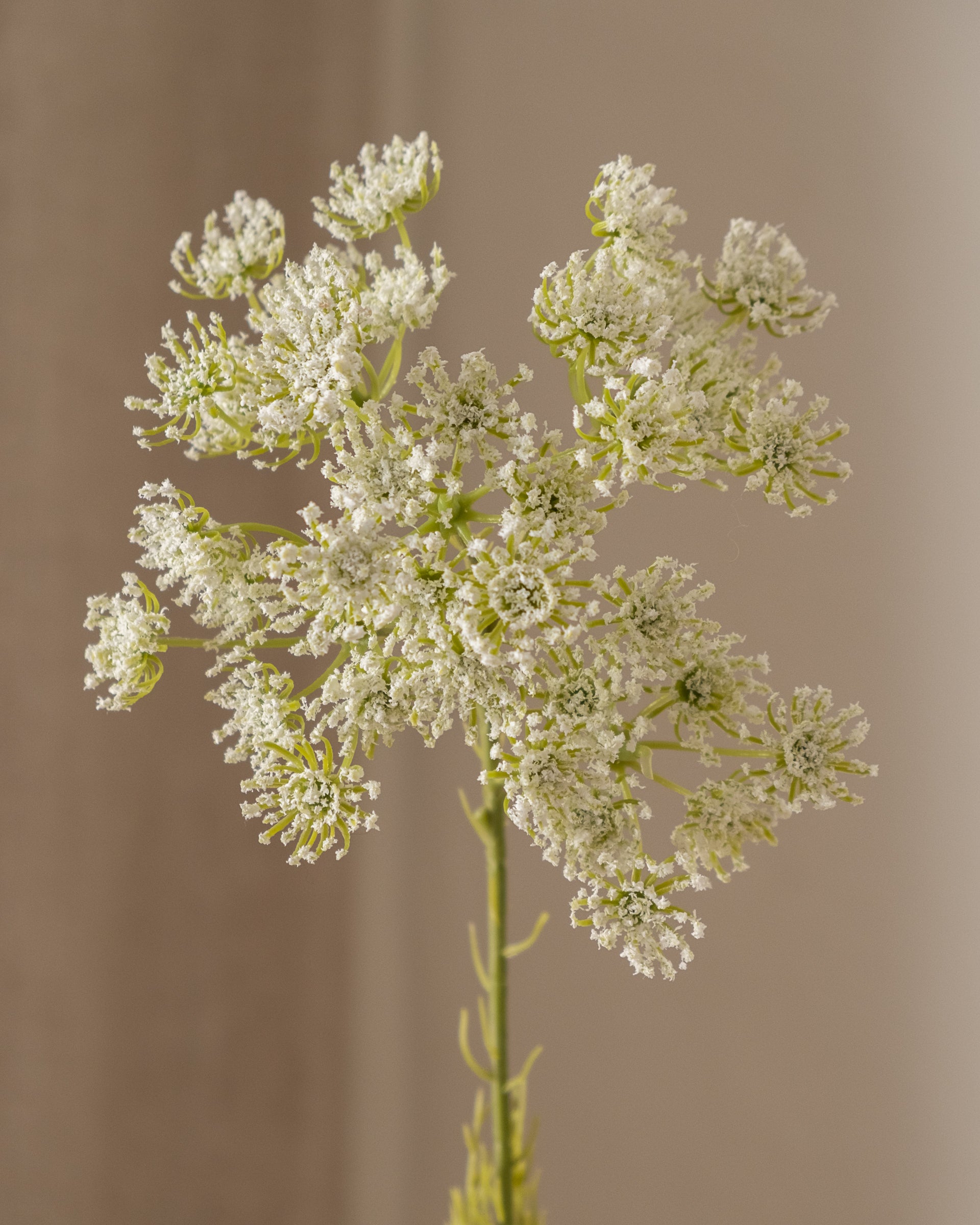 Queen Anne's Lace Flower er en elegant kunstig blomst som tilfører en delikat og naturlig touch til enhver dekorasjon. Med sine fine, hvite blomster og realistiske detaljer, er denne blomsten perfekt for å legge til fylde og tekstur i buketter og arrangementer.