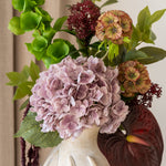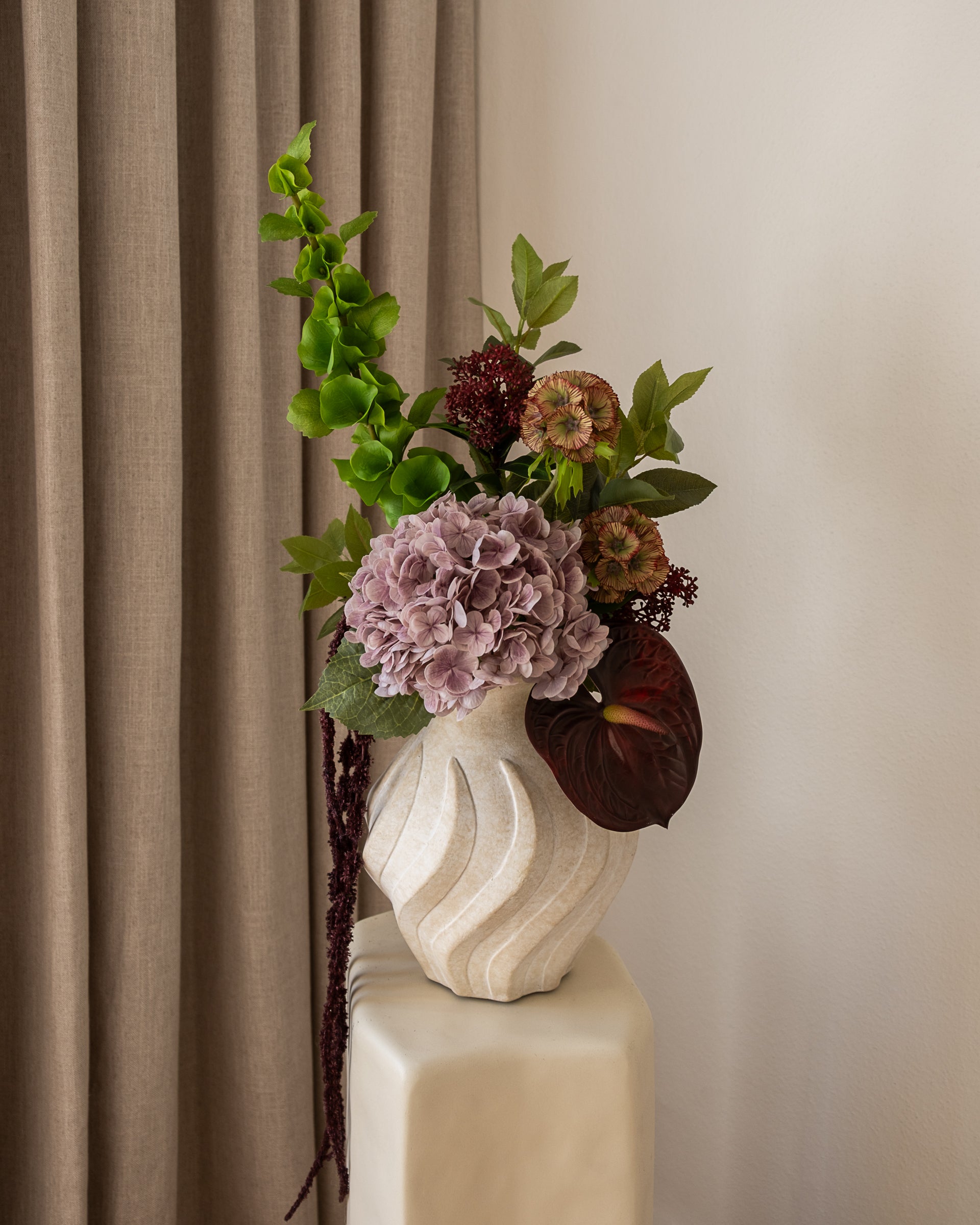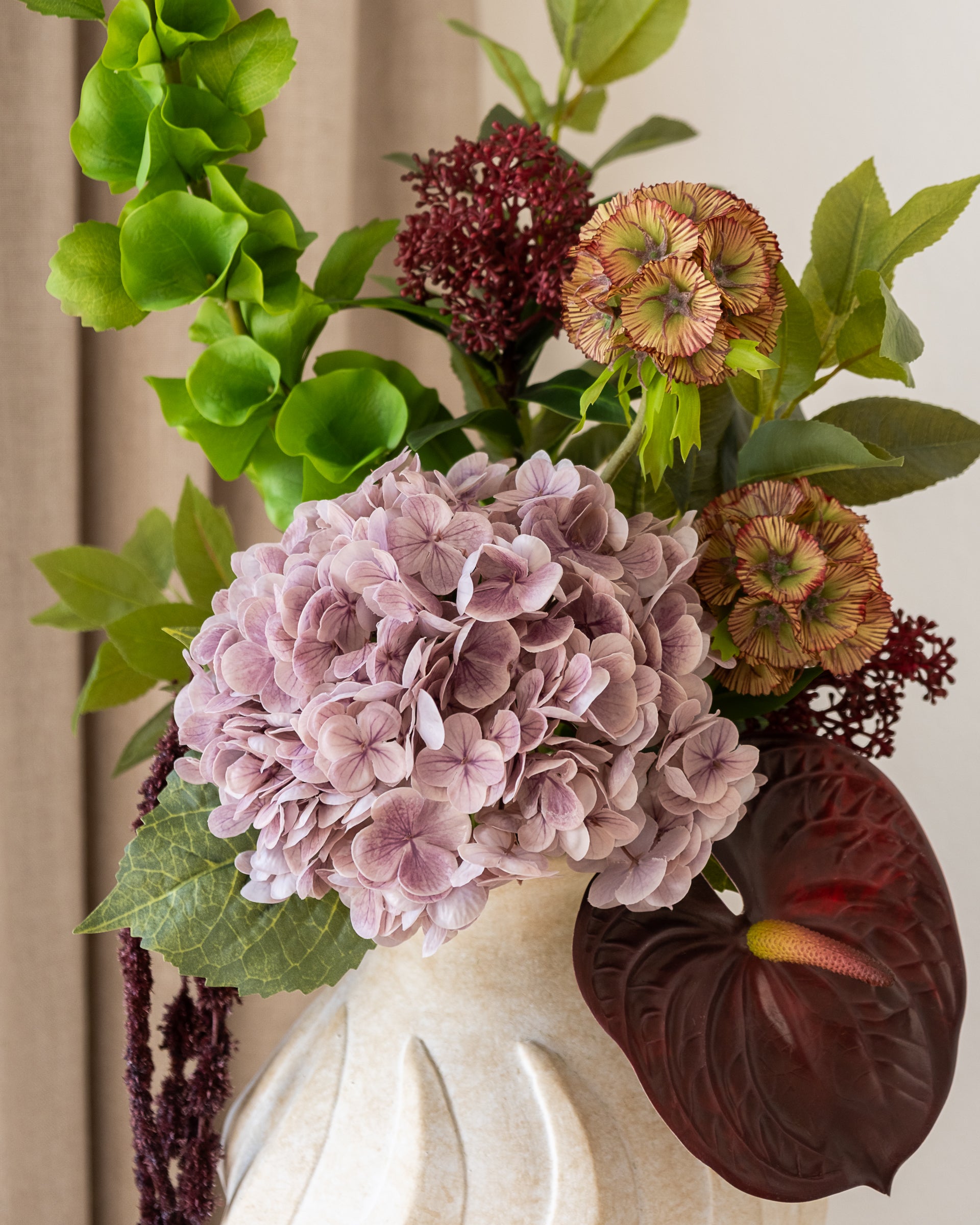 En elegant kunstig bukett i dus lilla og mørke aksenter. Naturtro blomster som gir et mykt og sofistikert uttrykk, perfekt til høsten.