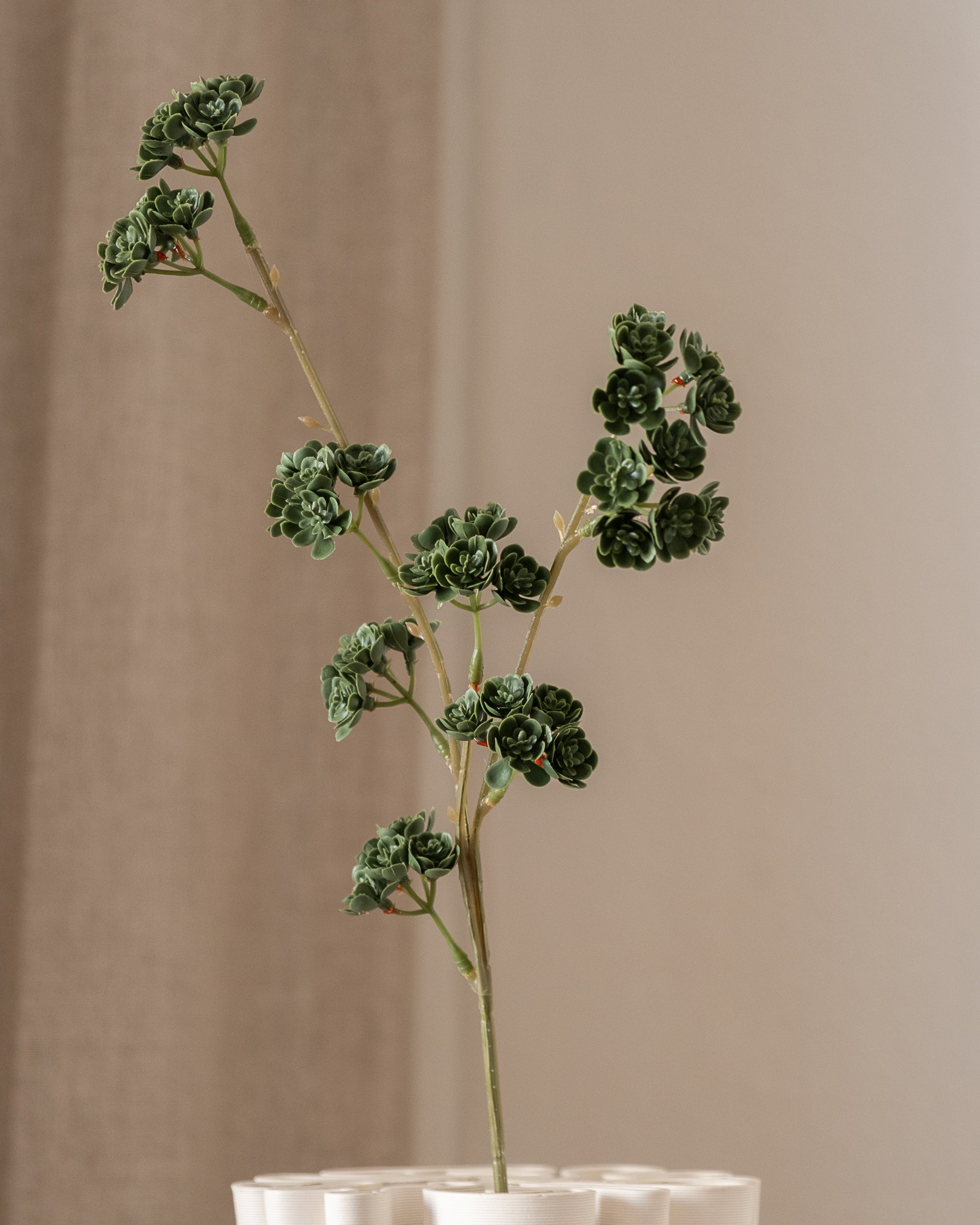 Med en høyde på 61 cm er Succulent Branch ideell for både små og store vaser, og den kan enkelt tilpasses for å passe inn i både buketter og som en frittstående dekorasjon. Denne grenen krever minimalt vedlikehold og holder seg vakker og frisk hele året rundt.