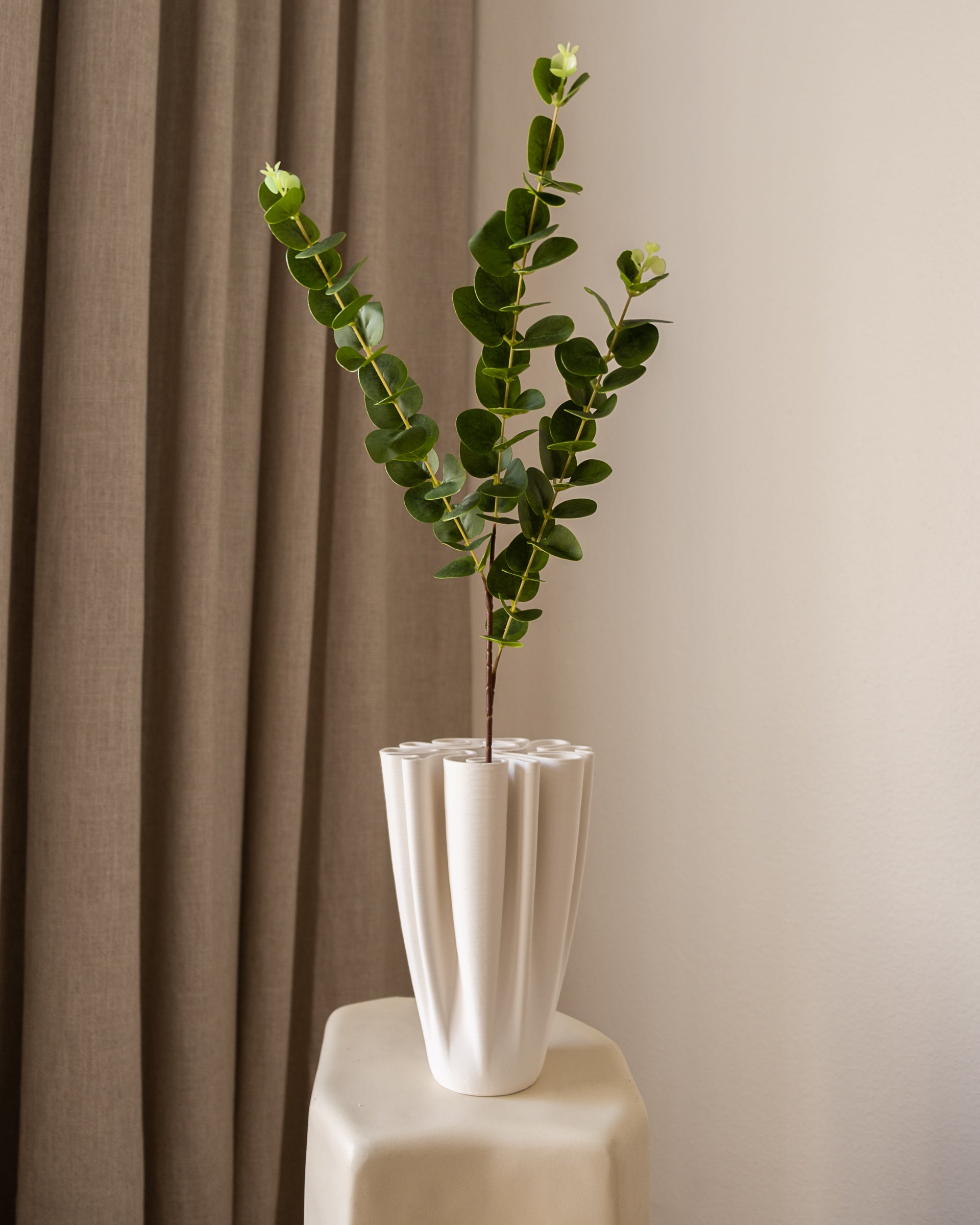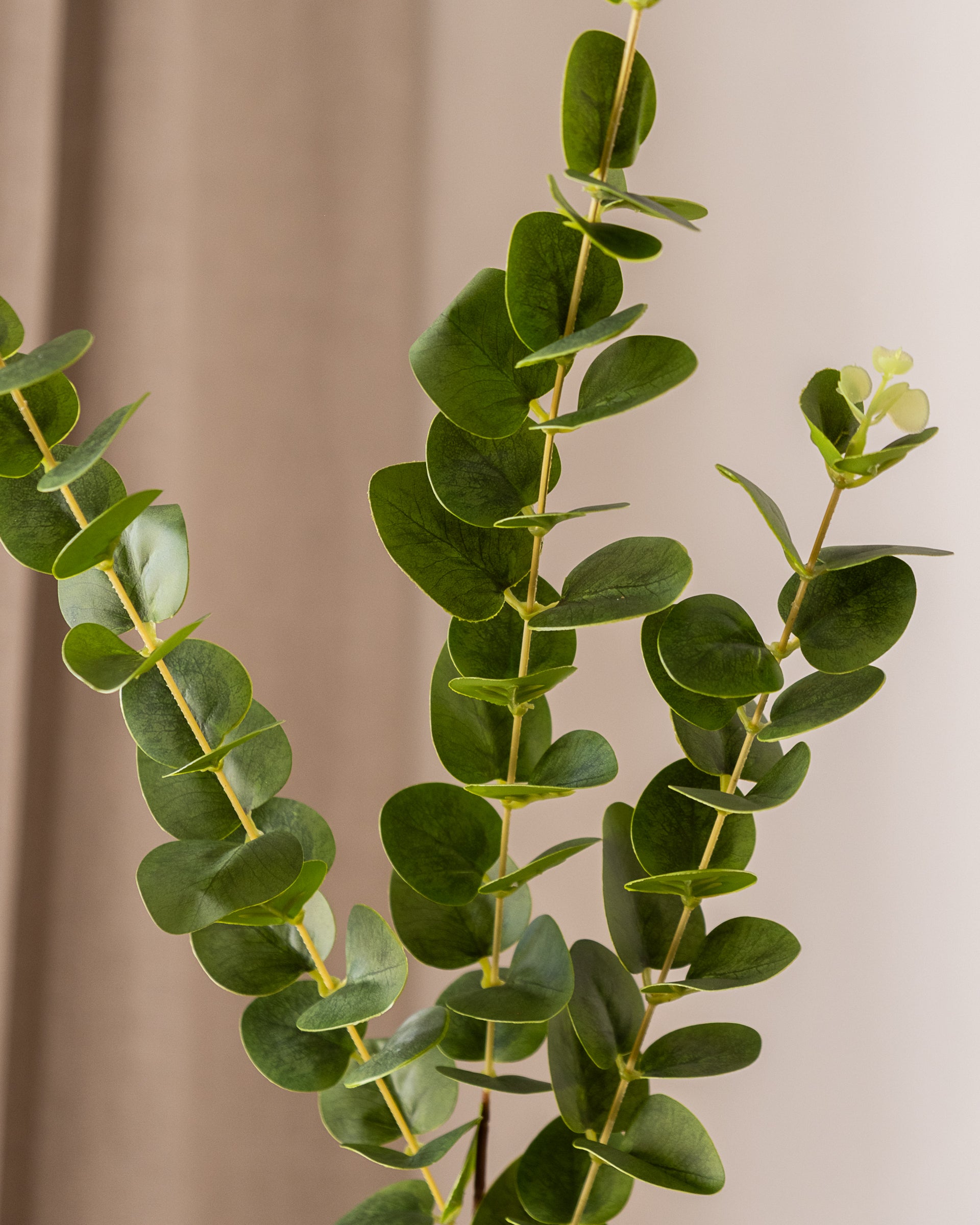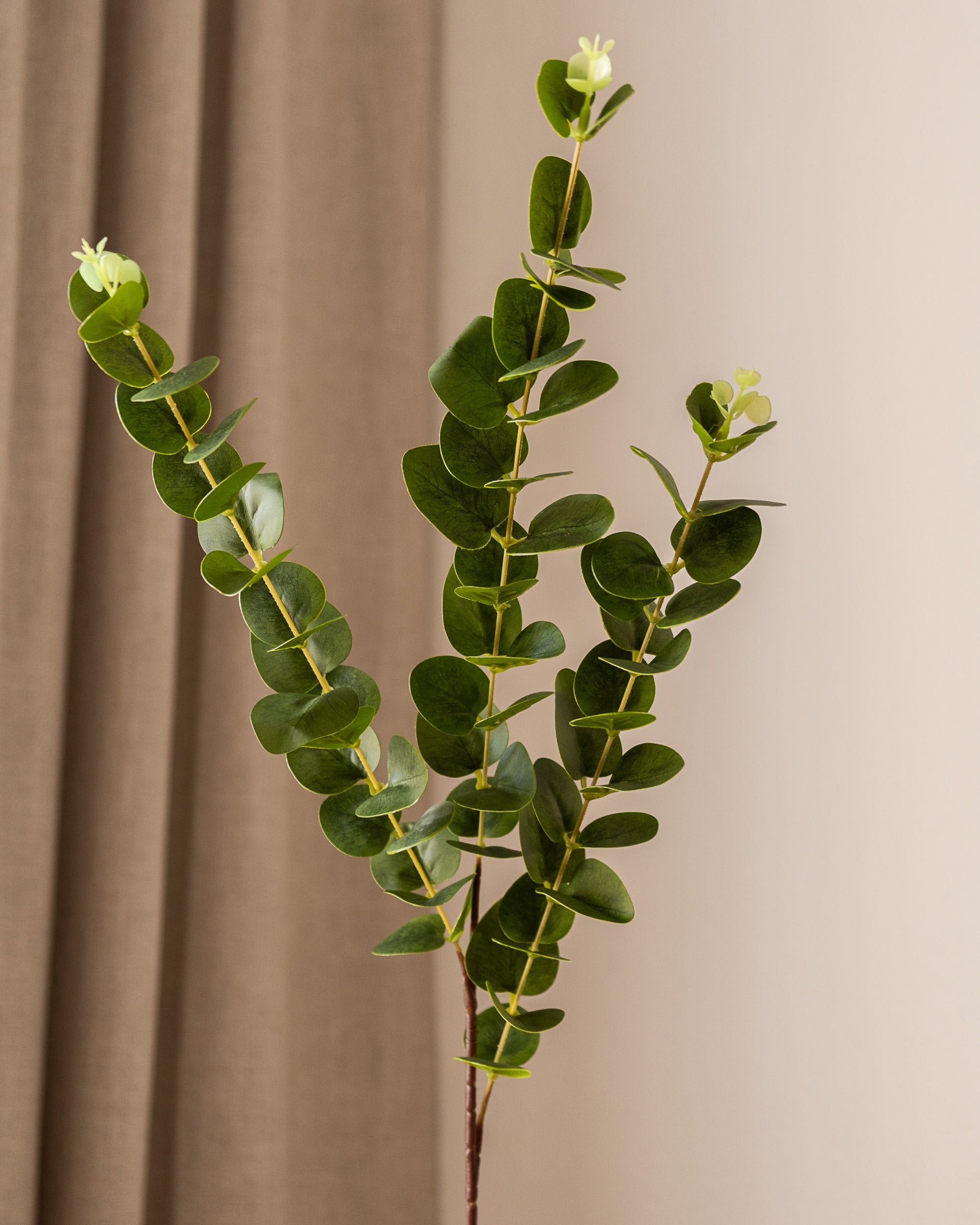 En klassisk eucalyptusgren med tre naturtro forgreininger som gir volum og struktur til enhver oppsats. Den luftige formen gjør den like fin alene i en vase som i kombinasjon med blomster eller andre grener.