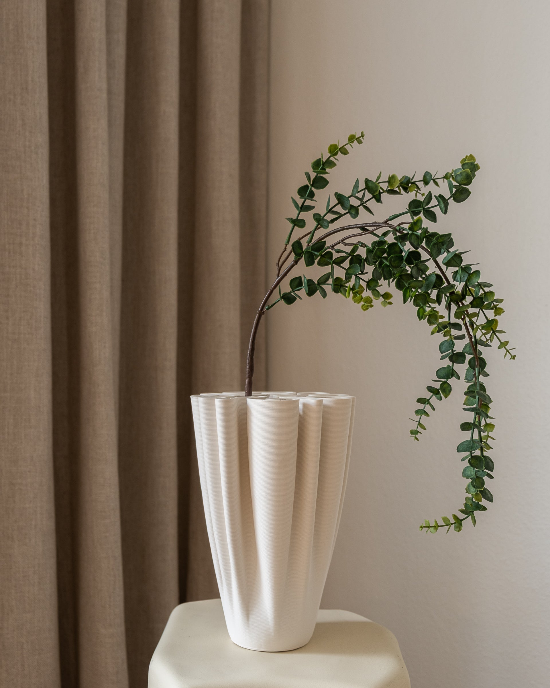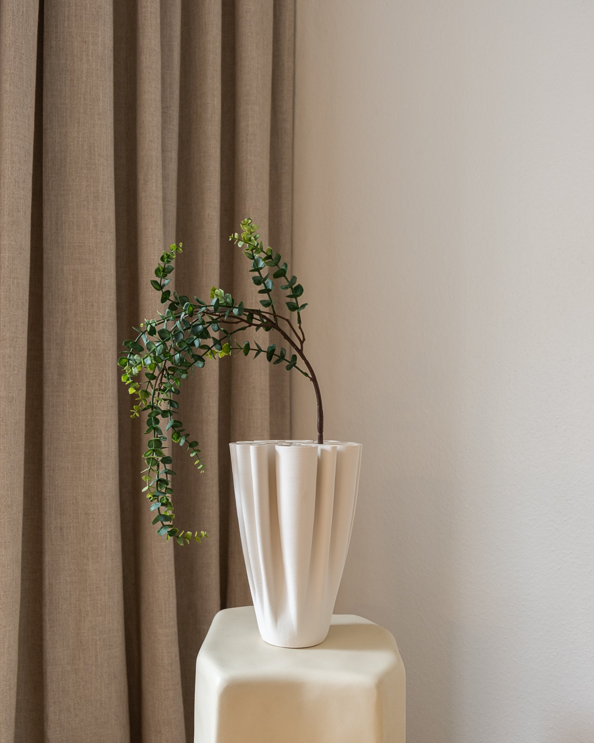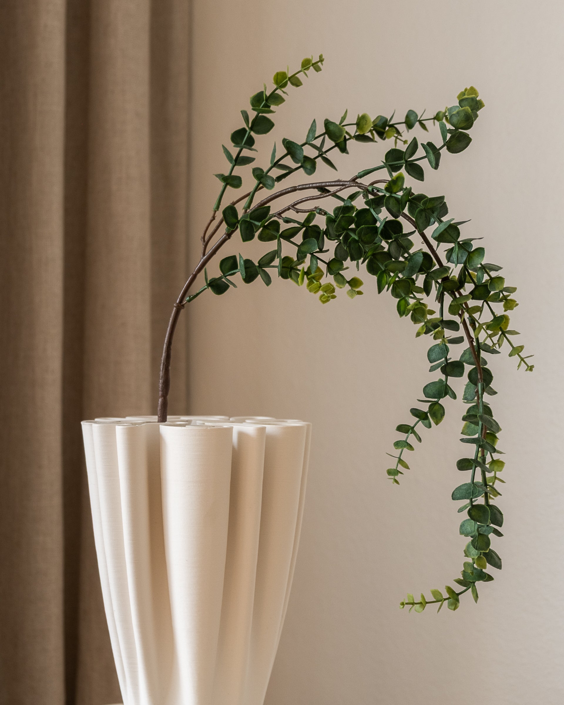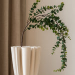 Denne eucalyptusgrenen har små, tette blader som gir en frisk og naturlig struktur. Formen gjør den perfekt til å skape bevegelse og fylde i oppsatser, samtidig som den tilfører et mykt og harmonisk uttrykk når den står alene i en vase.