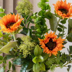 En lys og livlig kunstig bukett i varme oransje toner. Naturtro blomster som fanger høstens solfylte stemning og bringer energi inn i rommet.