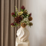 En varm kunstig høstbukett i brune og jordnære toner, balansert med lyse detaljer. Naturtro blomster som gir en rustikk, moderne høstfølelse.