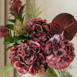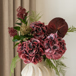 En høstbukett i dype burgunder- og rødfarger. Realistiske blomster med et luksuriøst preg – et tidløst blikkfang til sesongen.