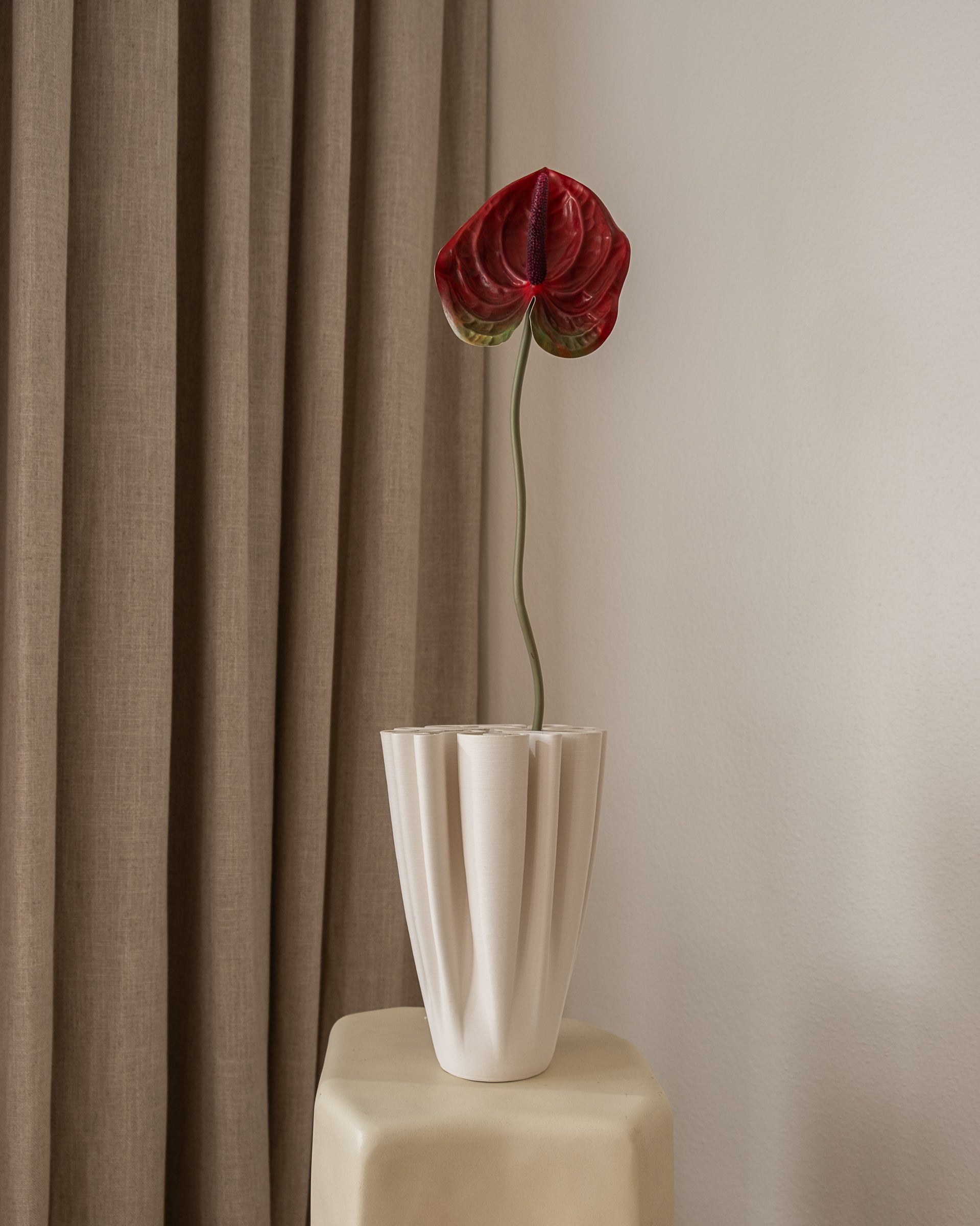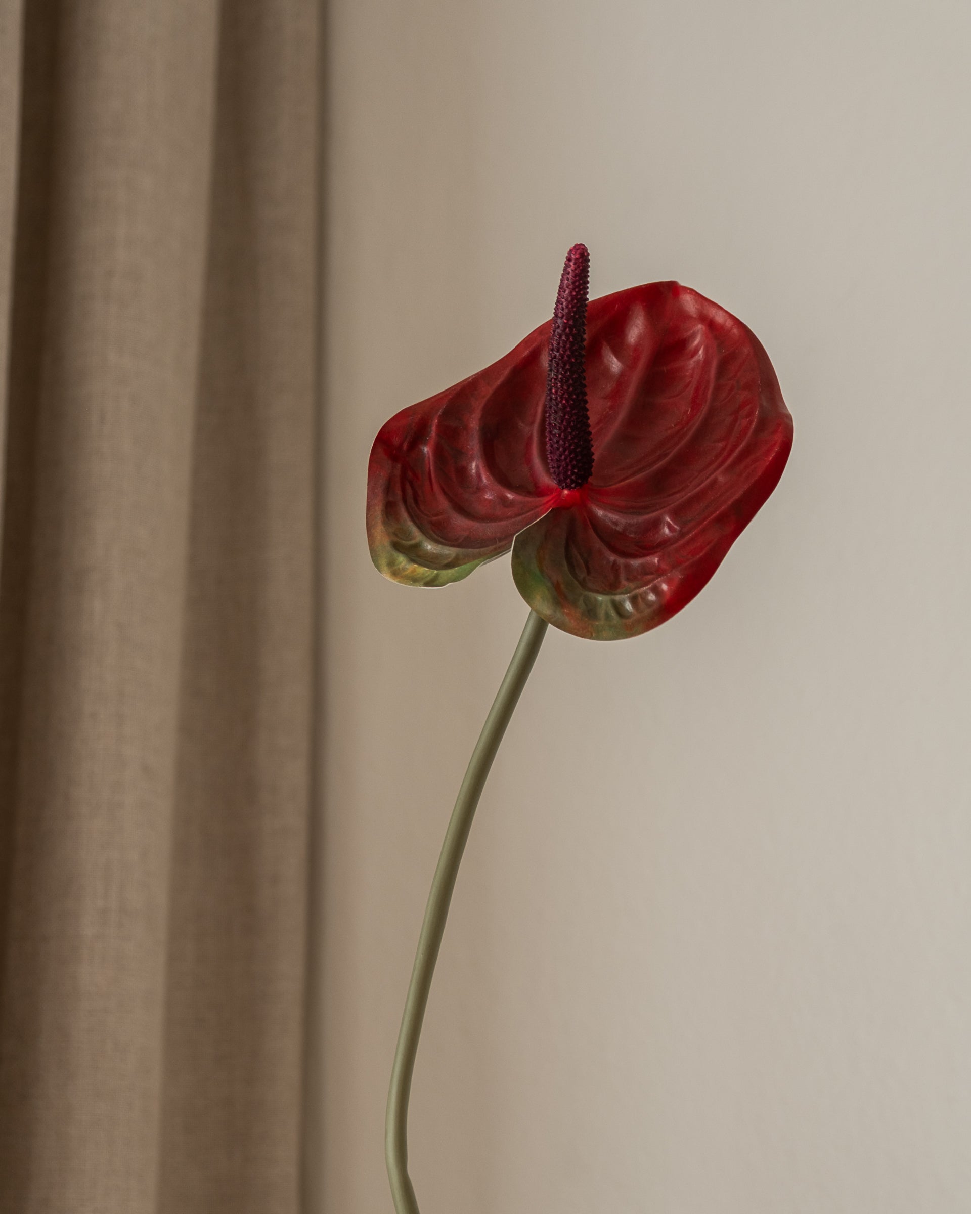 This artificial Anthurium flower features a unique and striking form, perfect for making a bold statement. With a height of 67 cm, it stands out beautifully on its own or when combined with other flowers to create a distinctive bouquet.