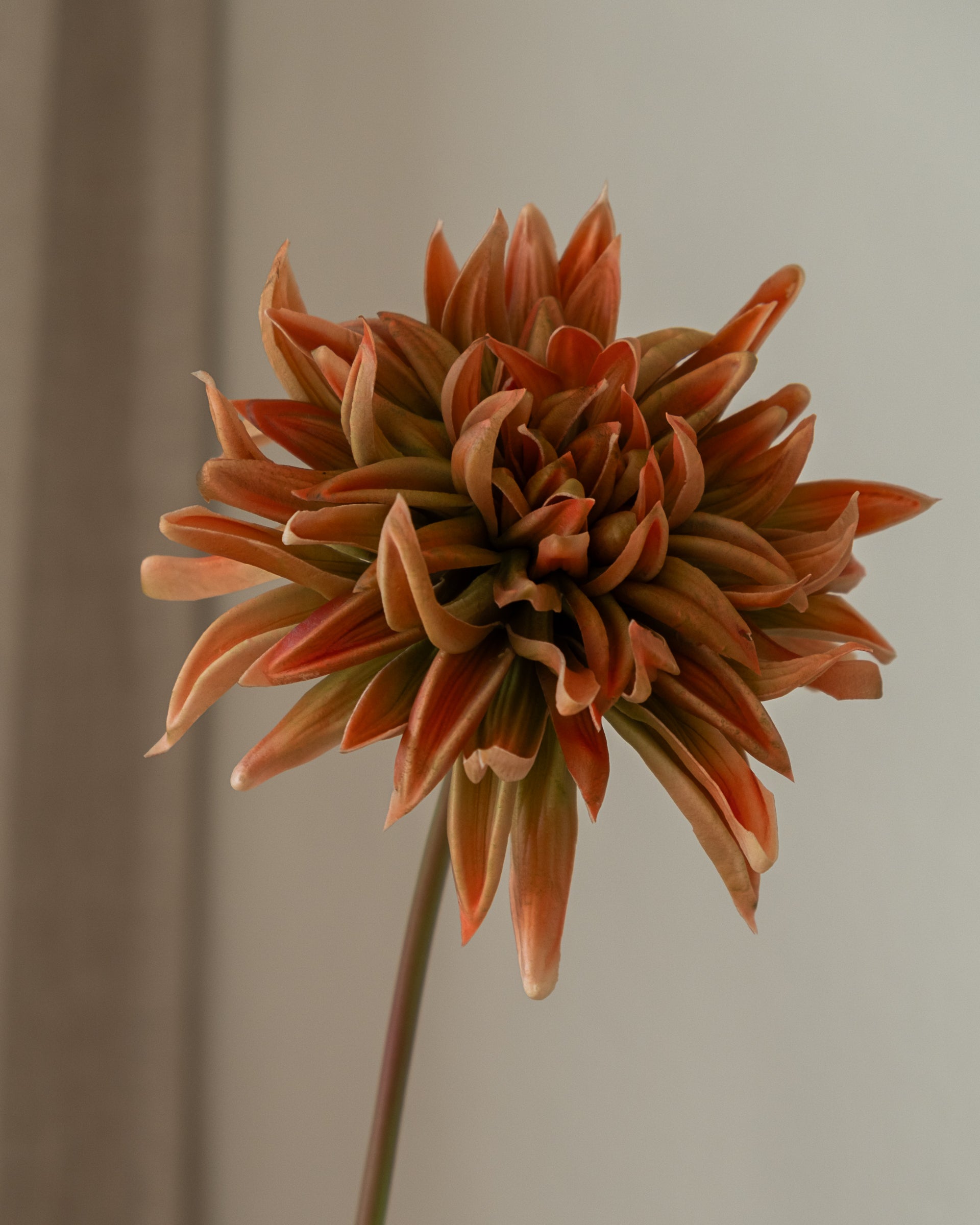 Cactus Dahlia er en dramatisk og elegant blomst som utmerker seg med sine mange, smale kronblad som danner en frodig og skulpturell form. Den kunstige varianten på 55 cm er naturtro i både farge og struktur, og tilfører et sofistikert uttrykk til enhver oppsats.