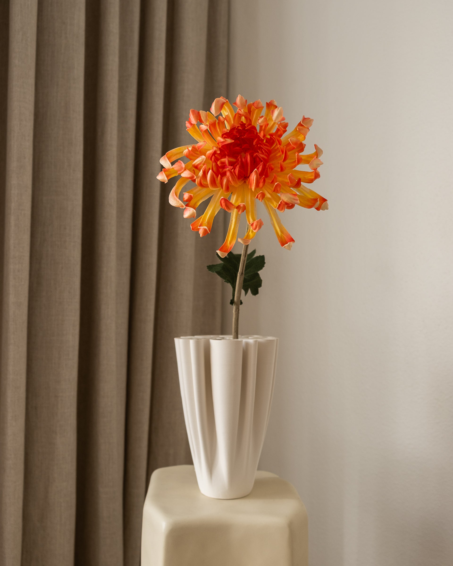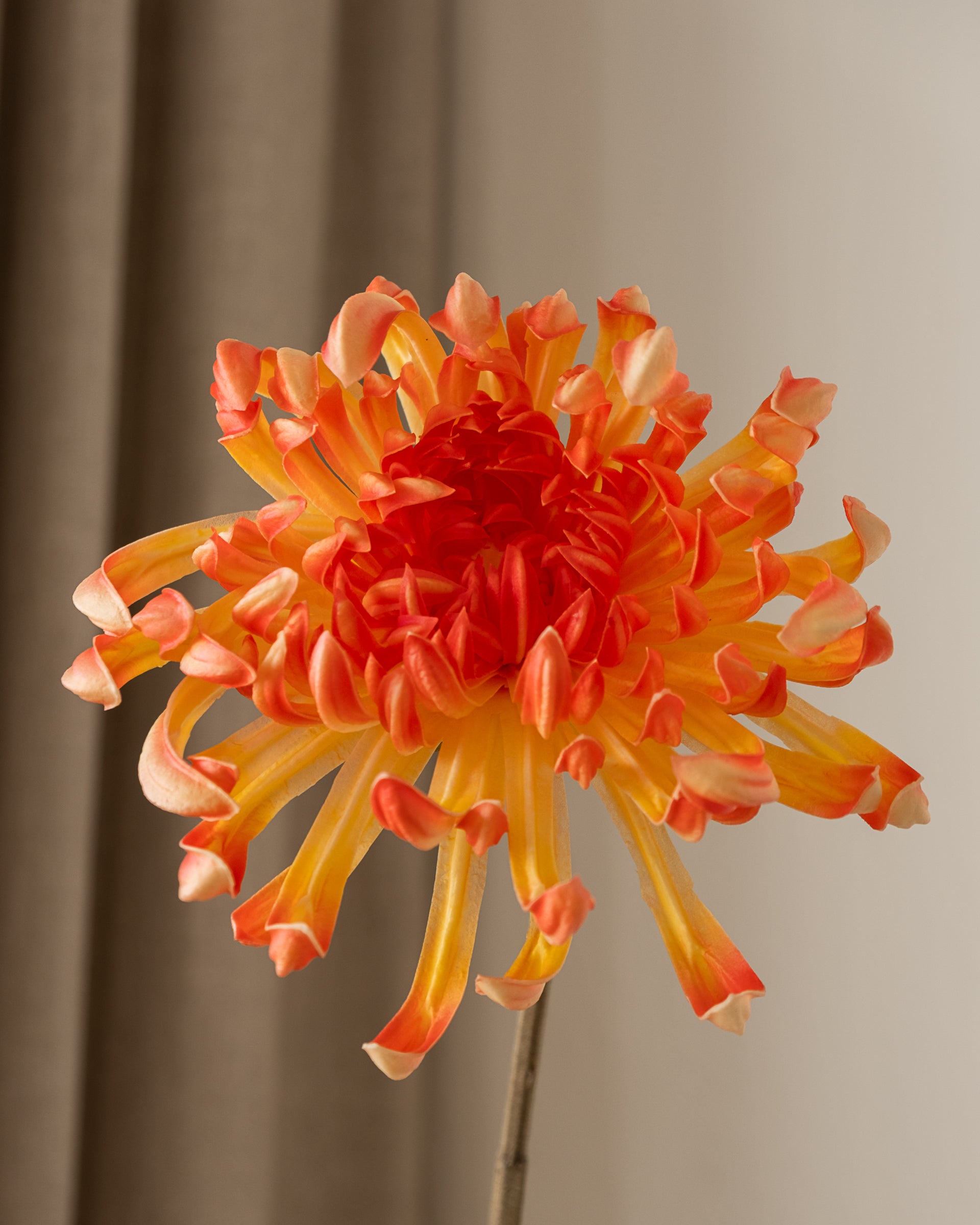 Med sin imponerende størrelse og frodige kronblader tilfører Chrysanthemum Large både volum og dramatikk til enhver dekorasjon. Den skulpturelle formen på 80 cm gjør den perfekt som et statement alene i en vase, samtidig som den gir dybde og struktur når den kombineres med andre blomster.