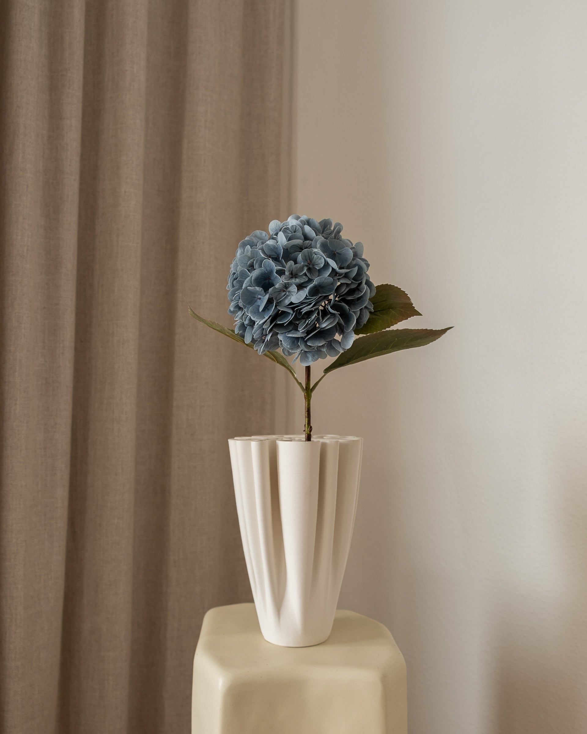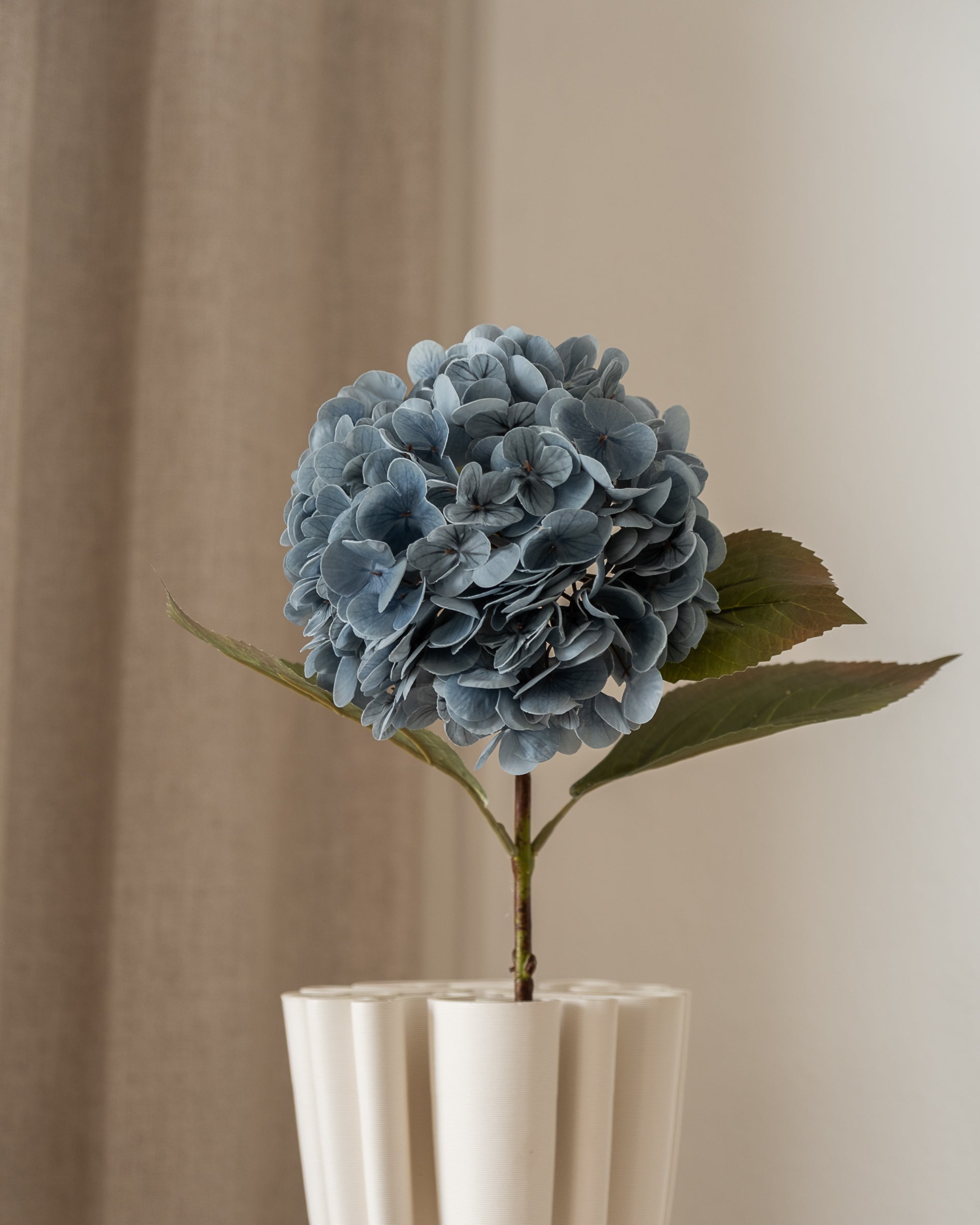 Denne kunstige hortensiaen har et fyldig blomsterhode med myke kronblader som gir et tidløst og elegant uttrykk. Den medium store størrelsen gjør den ideell både alene i en vase som et blikkfang, og sammen med andre blomster for å skape en balansert og frodig oppsats.