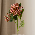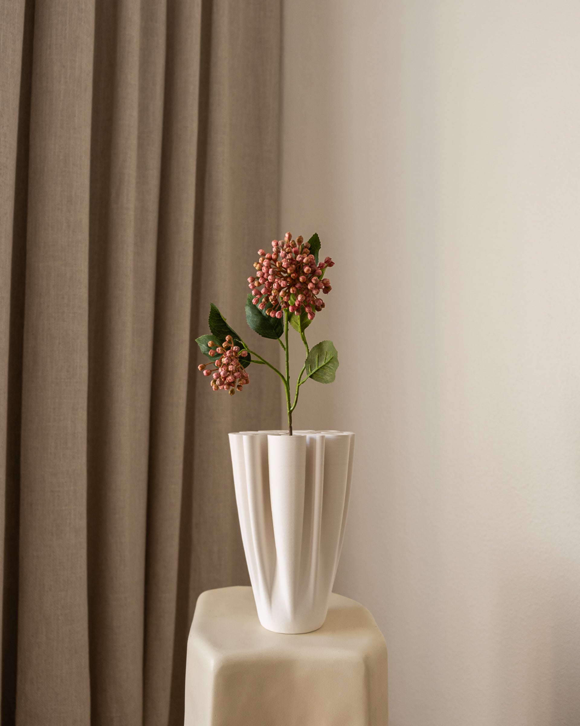 En dekorativ gren med små, runde bær samlet i tette klaser. Den gir struktur og fylde til oppsatser, samtidig som den tilfører et lett og lekent uttrykk når den brukes alene i en vase.