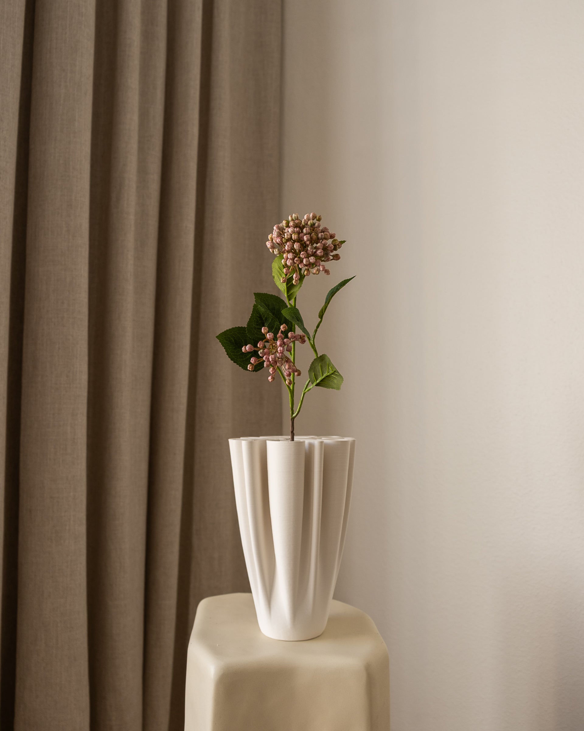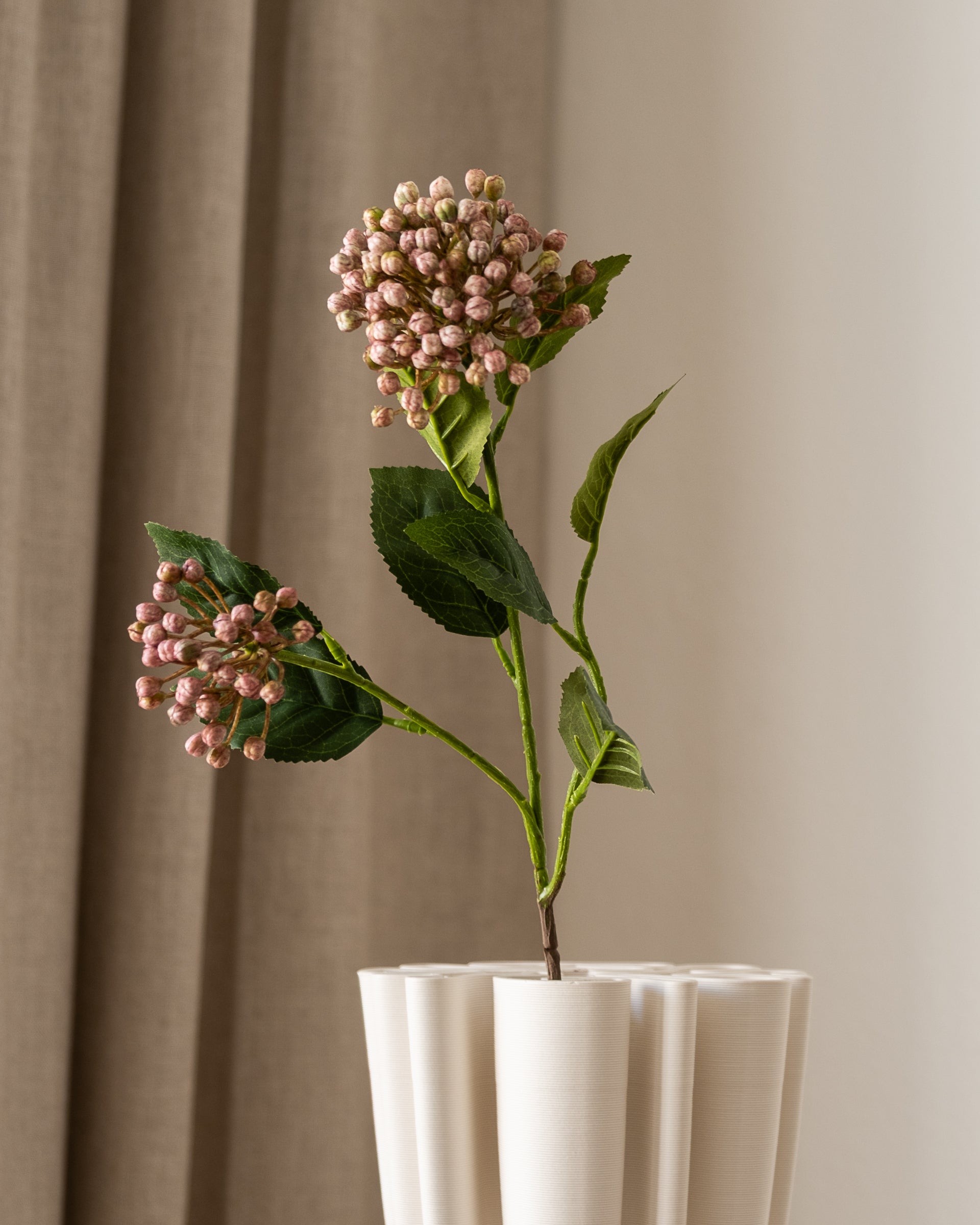 En dekorativ gren med små, runde bær samlet i tette klaser. Den gir struktur og fylde til oppsatser, samtidig som den tilfører et lett og lekent uttrykk når den brukes alene i en vase.