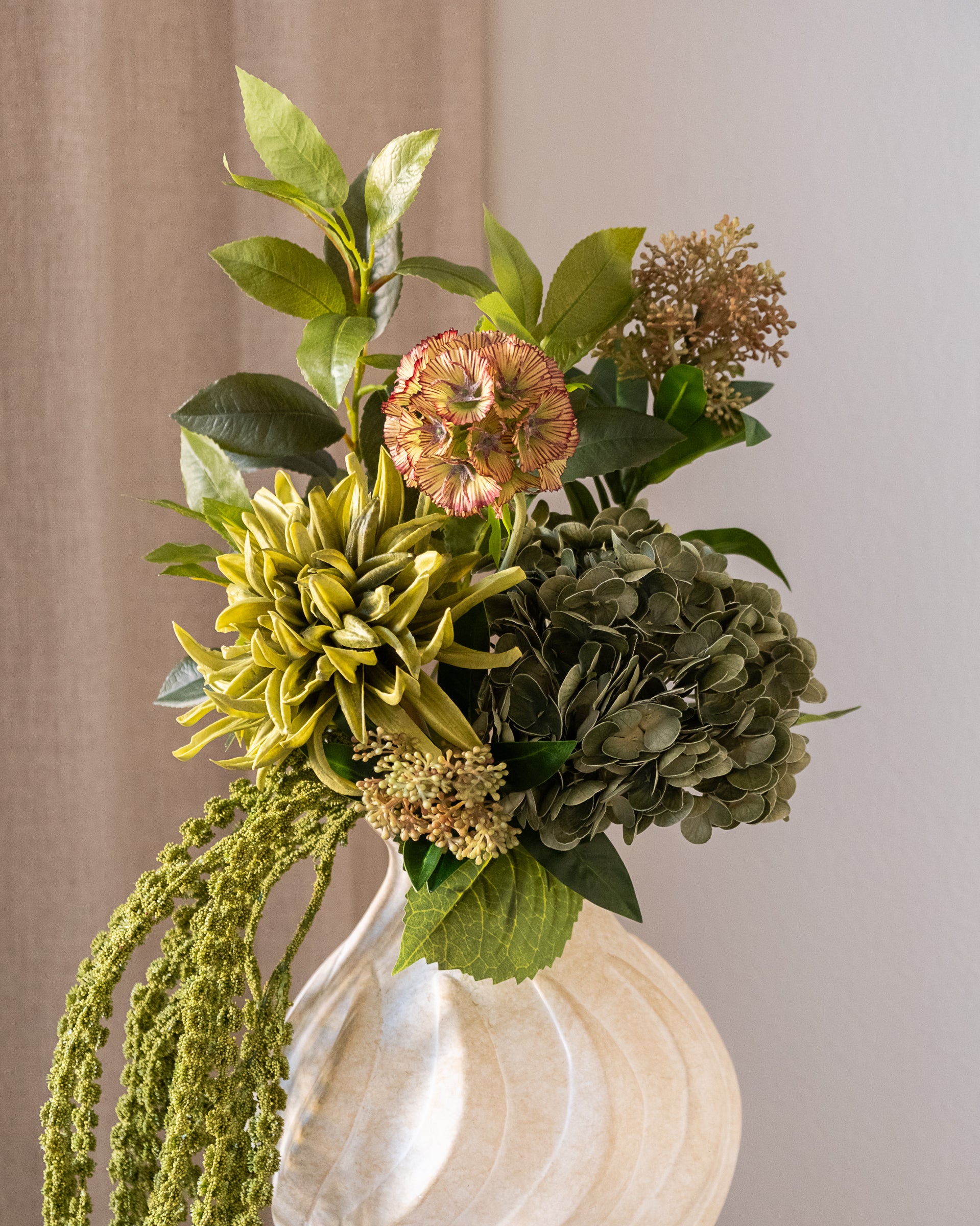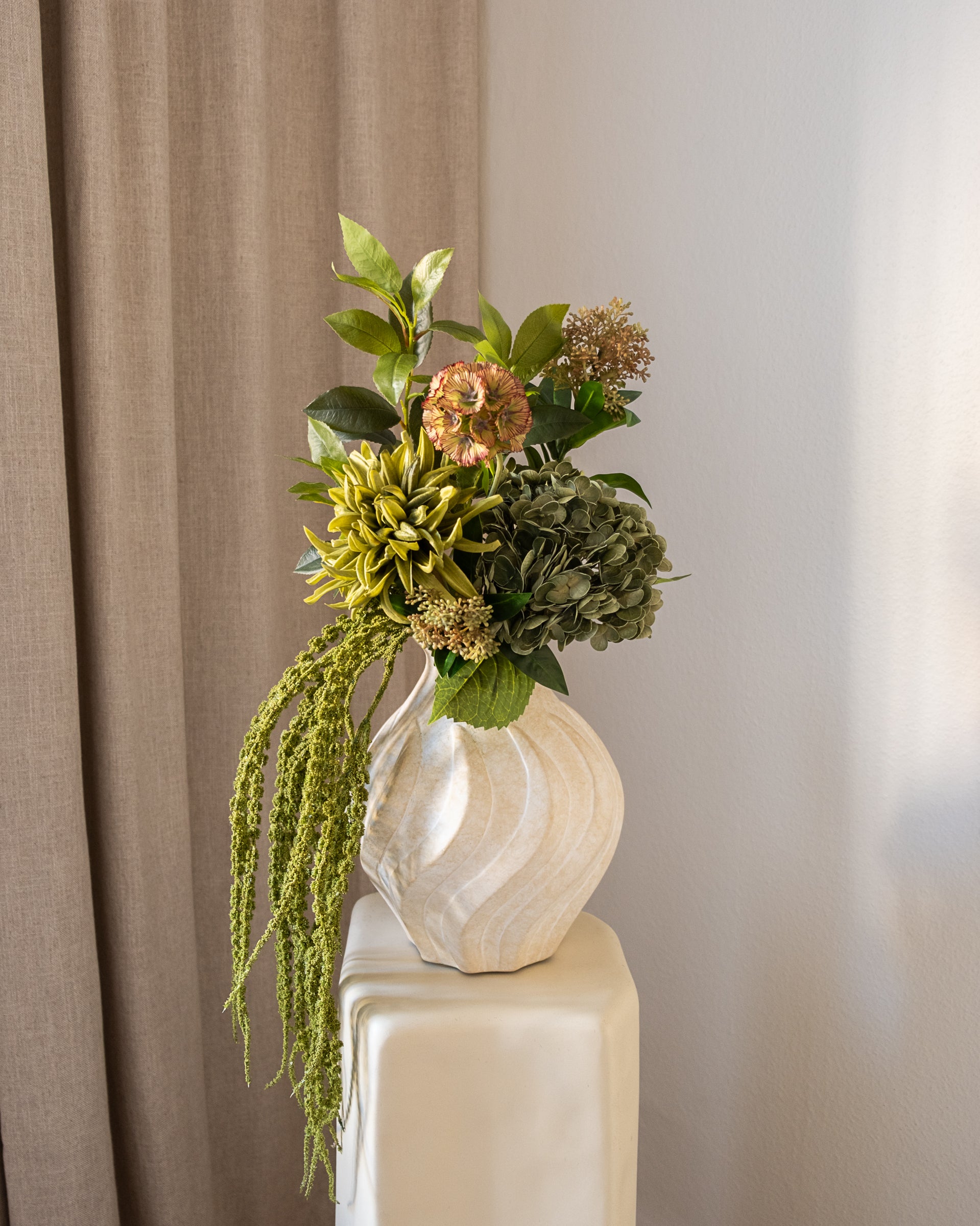 Buketten har et rolig, men tydelig uttrykk alene, og kan også kombineres med flere buketter for en mer fyldig oppsats. Stilkene kan både bøyes og klippes, slik at buketten enkelt kan tilpasses ulike stylinger.