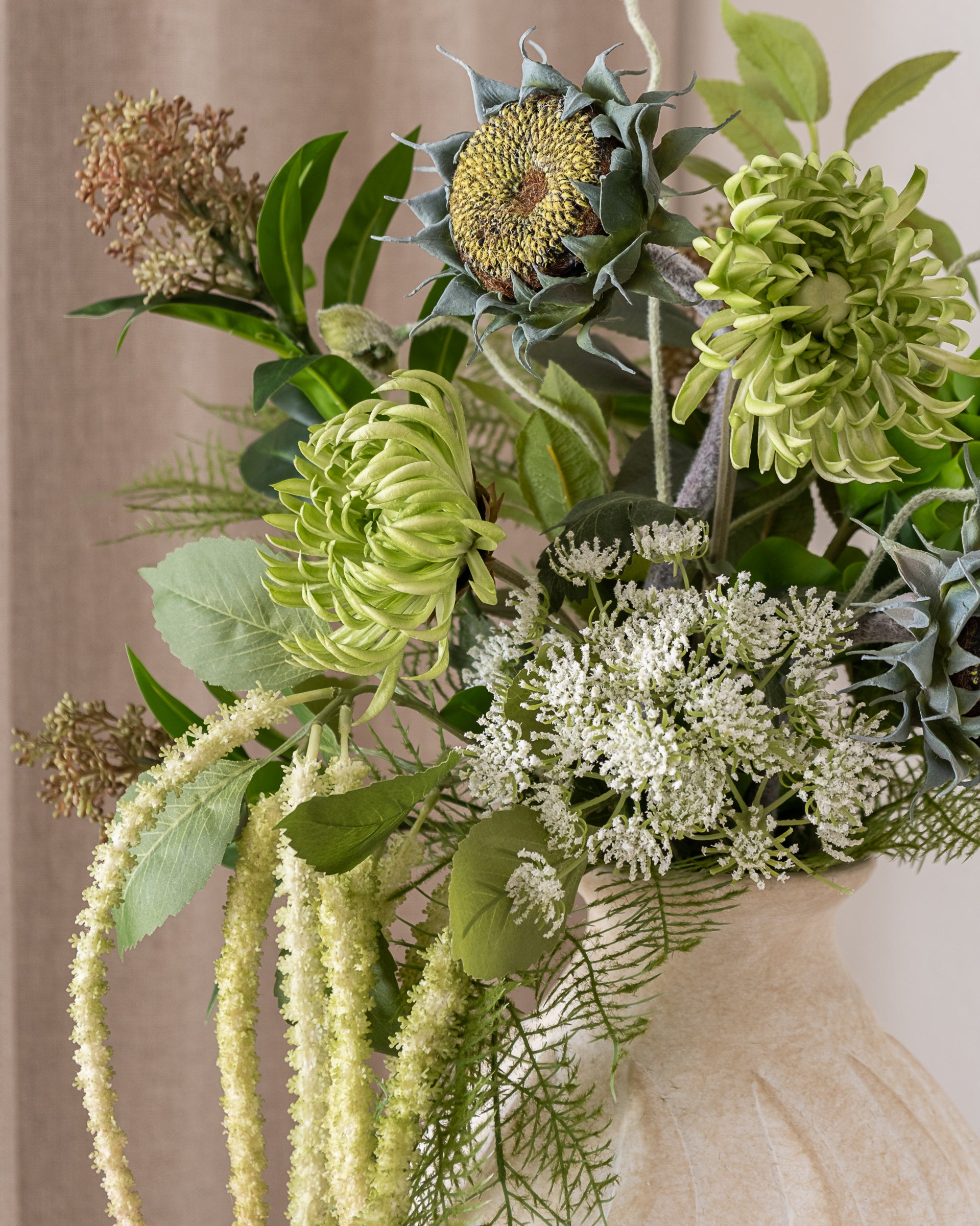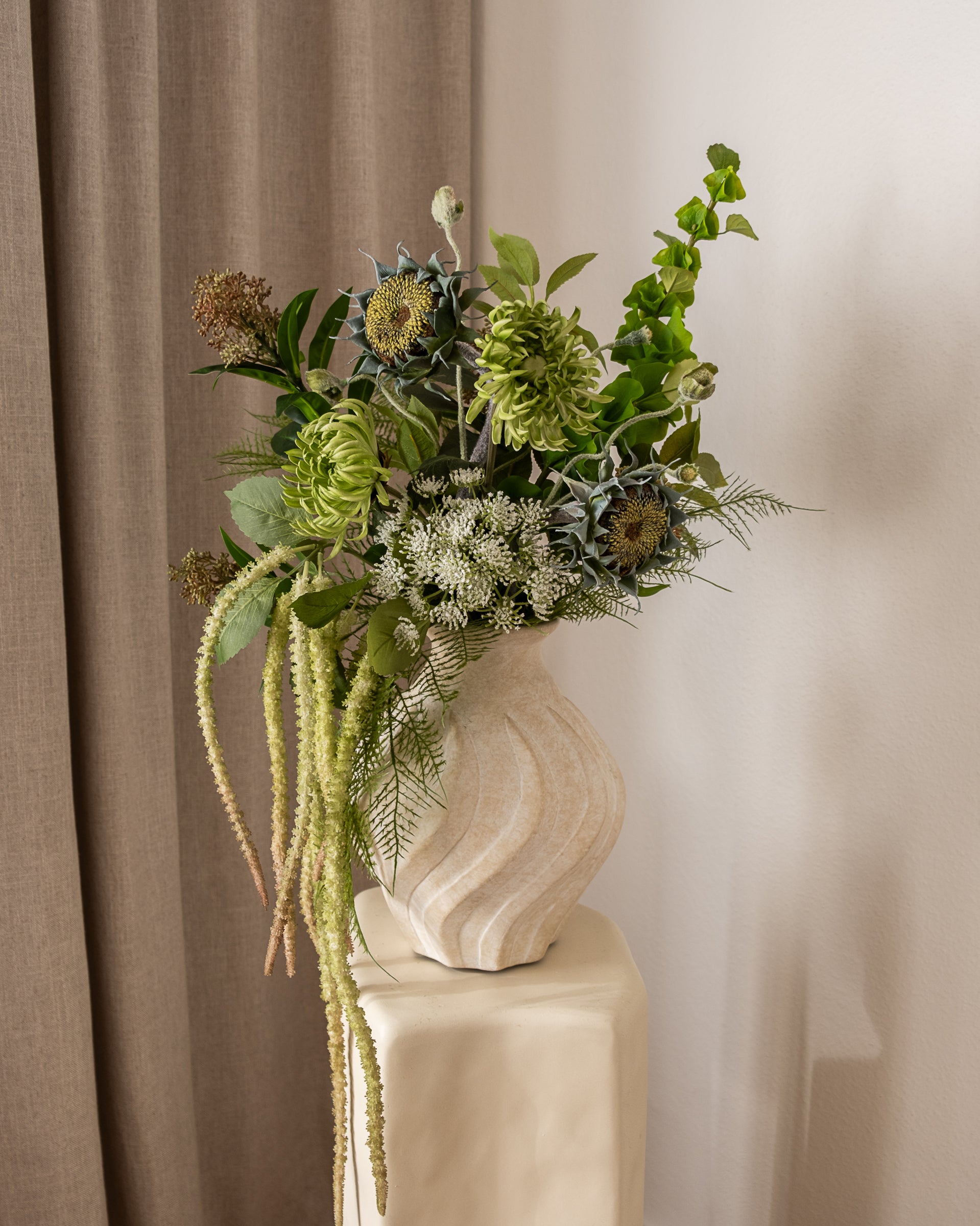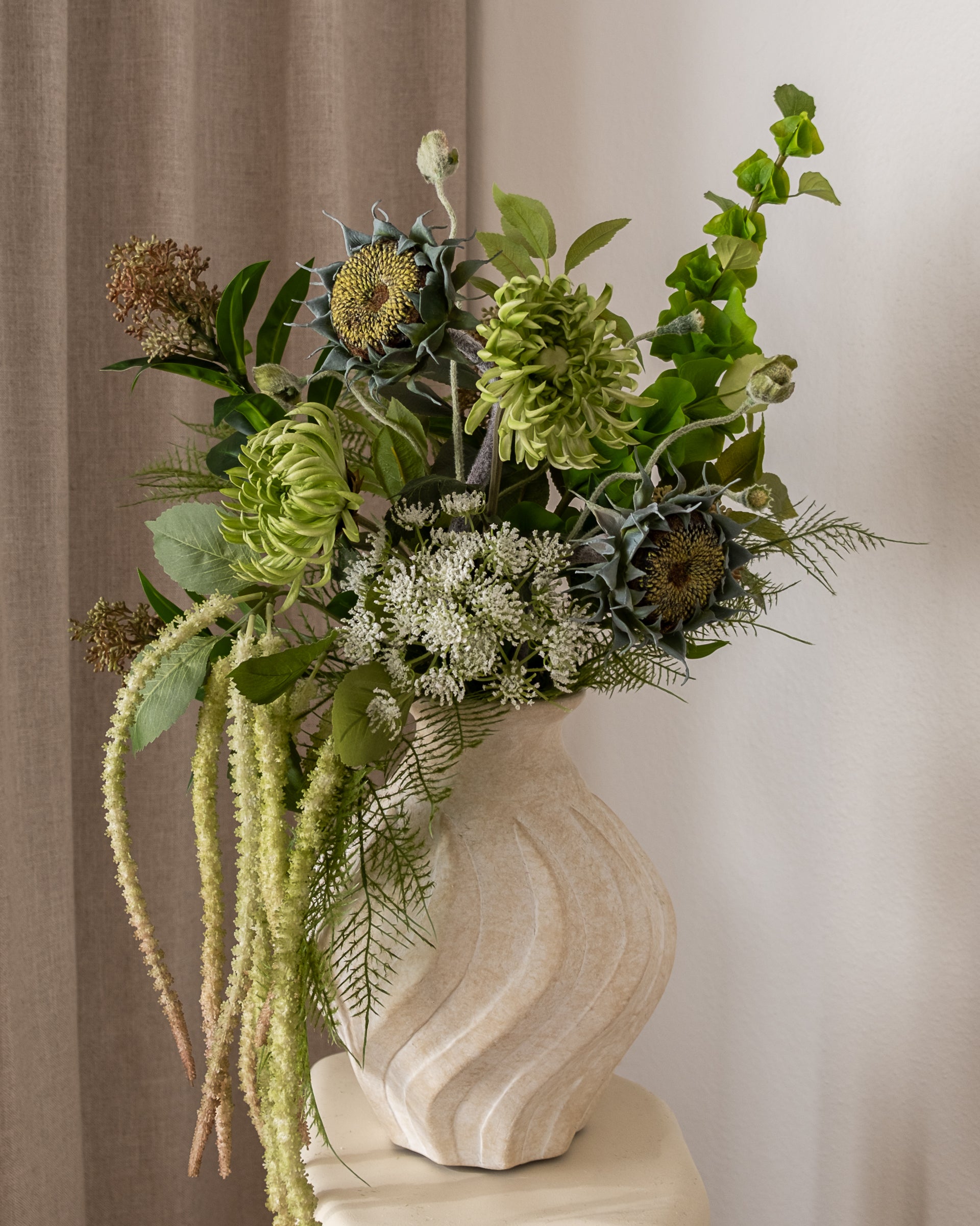 Matcha Grove Bouquet har et botanisk blomsterdesign med fokus på grønne teksturer og frisk energi. Sammensetningen gir et moderne og levende uttrykk som tilfører rommet et rent, naturlig preg.