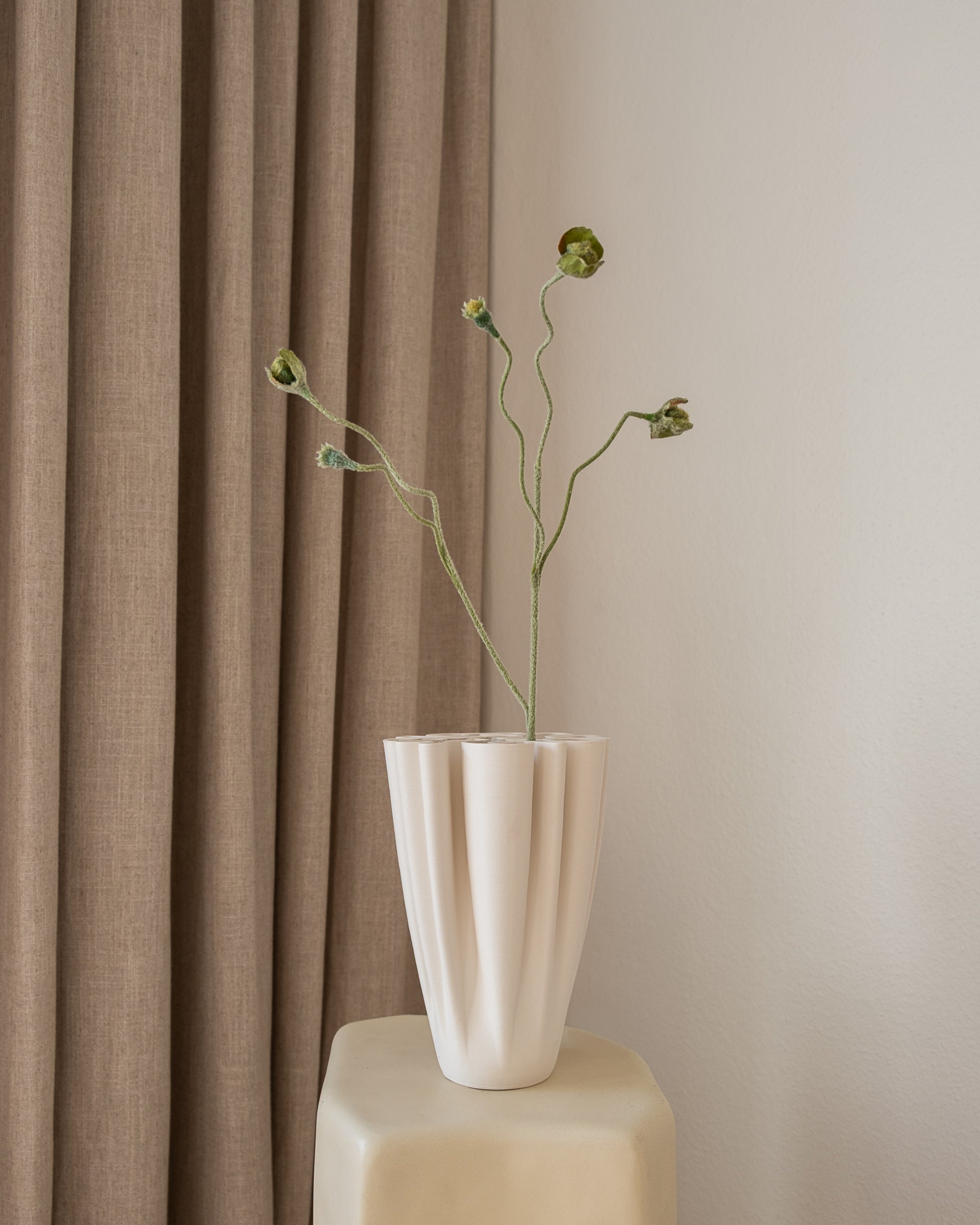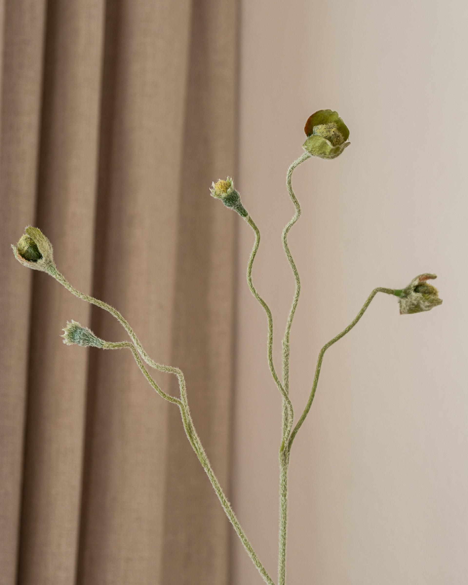 Med sine karakteristiske, lodne stilker og uåpnede knopper tilfører denne kunstige poppy-grenen et naturlig og skulpturelt uttrykk. Den organiske formen på 65 cm gir liv og bevegelse til oppsatser, og gjør den til et stemningsfullt innslag både alene i en vase og i kombinasjon med andre blomster.