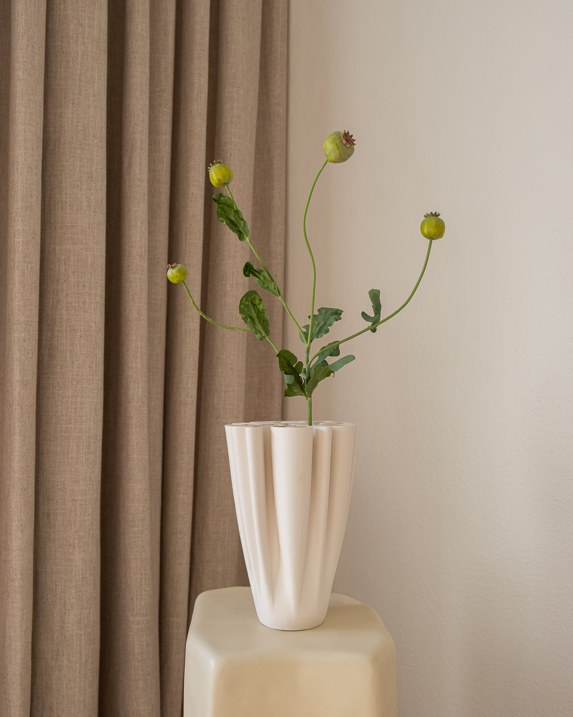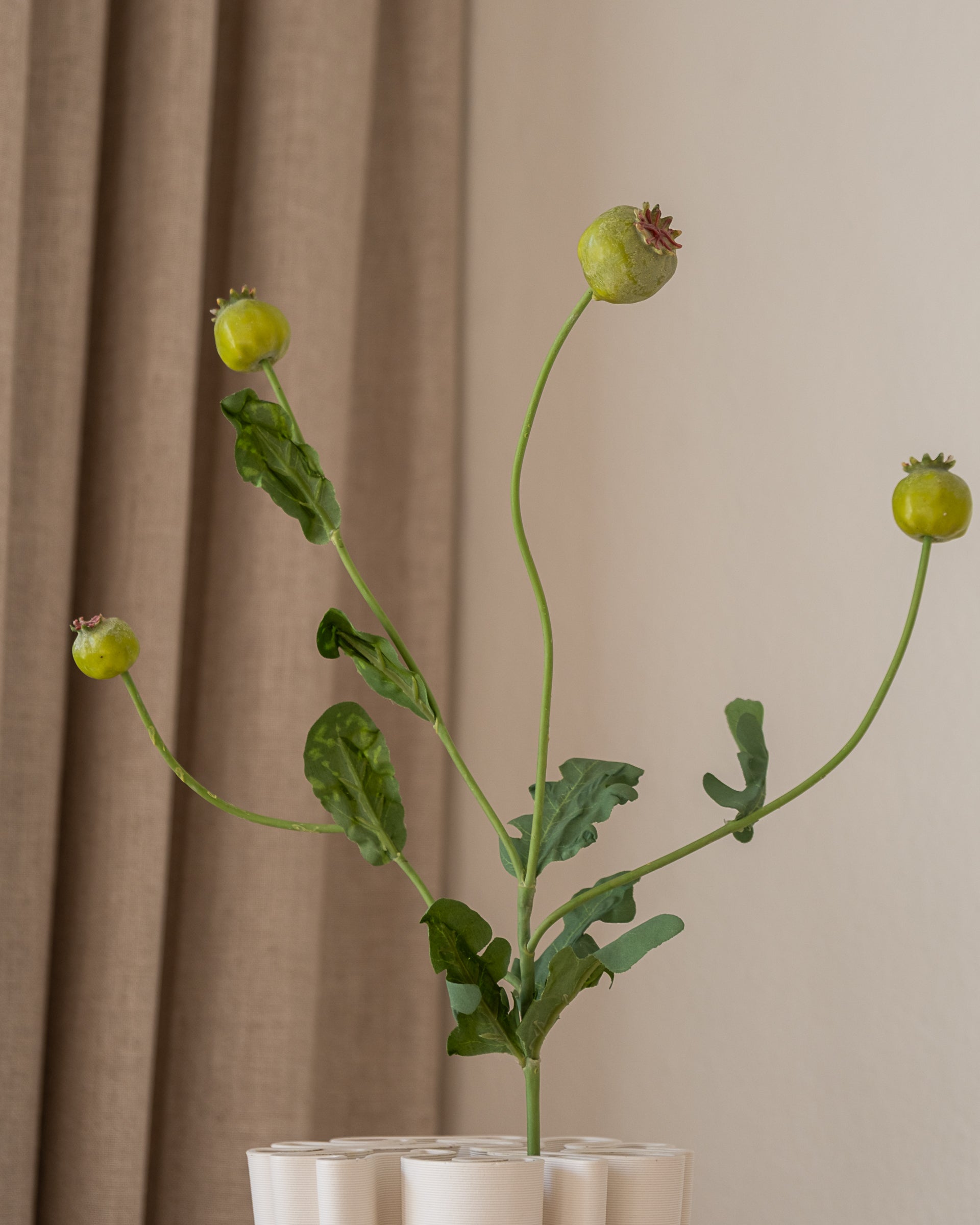 Denne kunstige valmuekapselen har en organisk og skulpturell form som tilfører dybde og karakter til dekorasjoner. Med sine markante frøkapsler på lange, elegante stilker skaper den et uttrykk som er både naturlig og moderne.