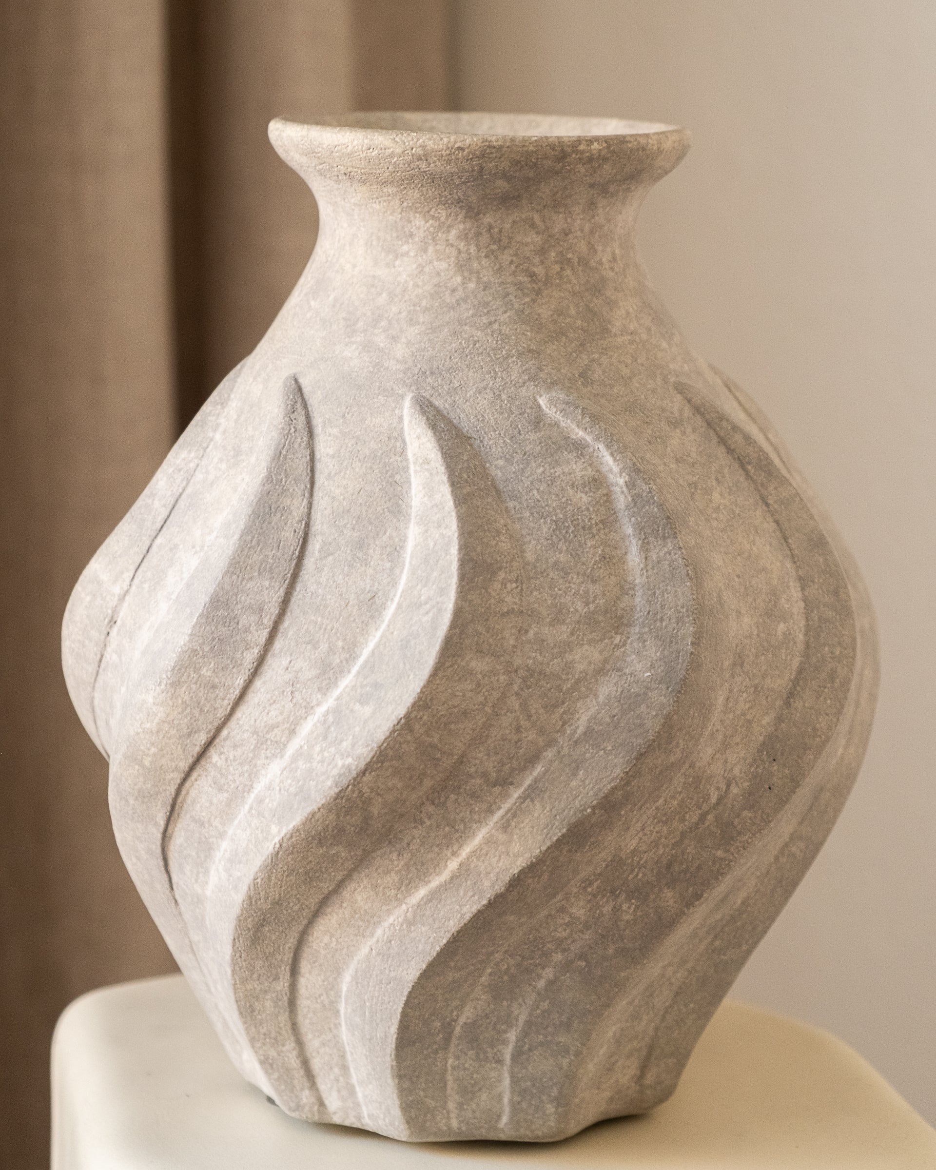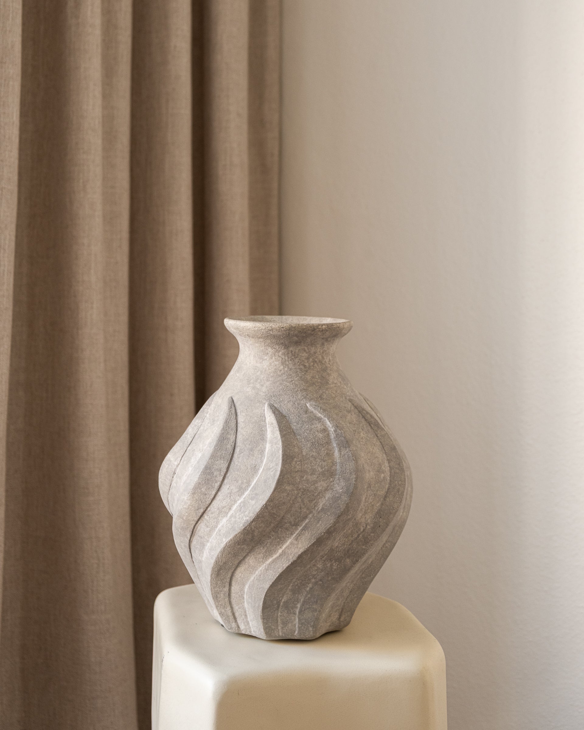 Swirl Vase er en keramikkvase med en vanntett, matt overflate som gir den et naturlig og tidløst preg. Vasens enkle, men elegante design passer perfekt i ethvert rom, og gir et sofistikert uttrykk til både moderne og klassiske interiør.