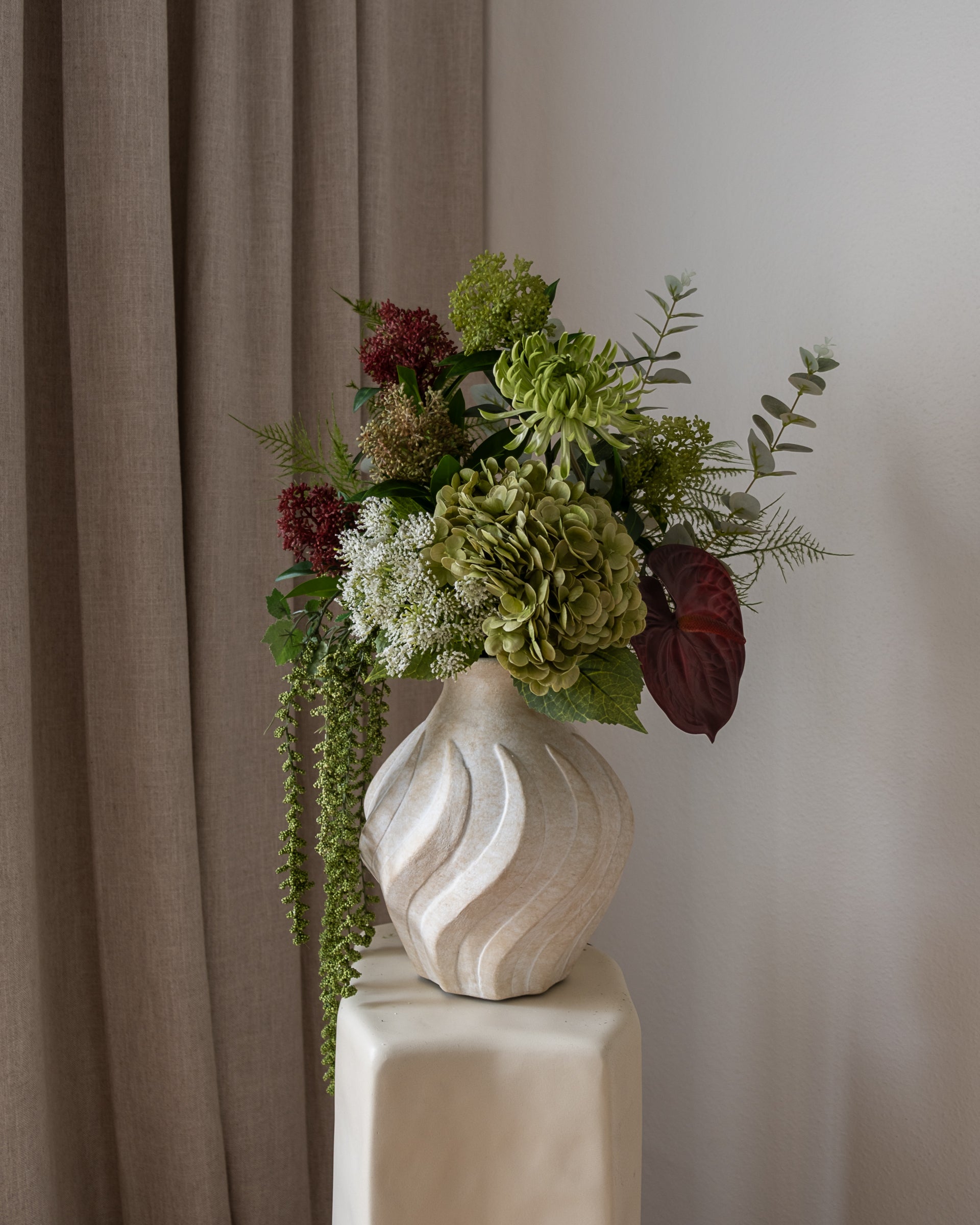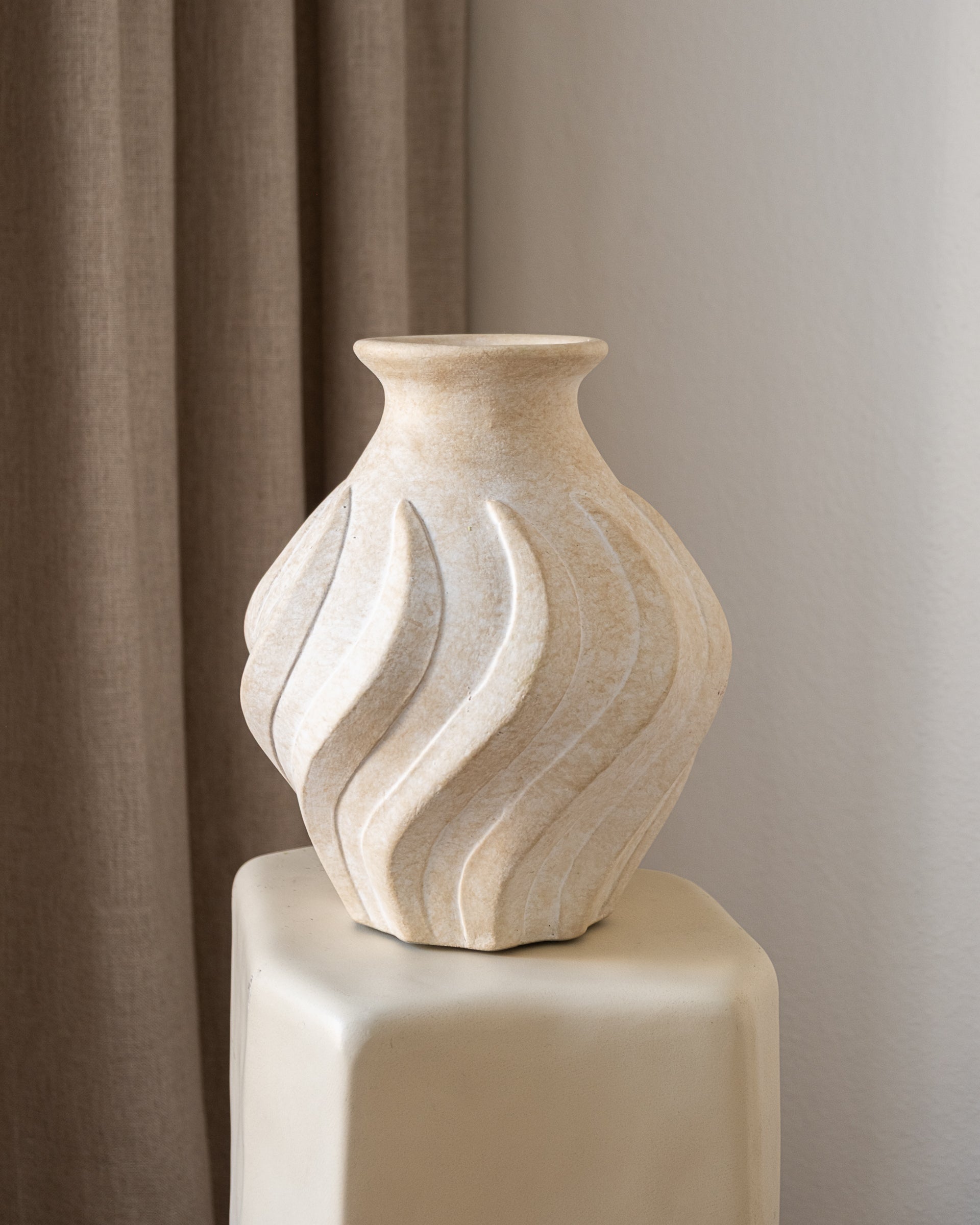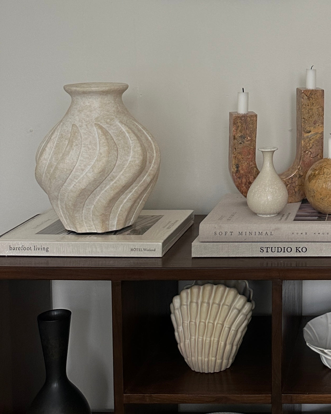 Swirl Vase er en keramikkvase med en vanntett, matt overflate som gir den et naturlig og tidløst preg. Vasens enkle, men elegante design passer perfekt i ethvert rom, og gir et sofistikert uttrykk til både moderne og klassiske interiør.