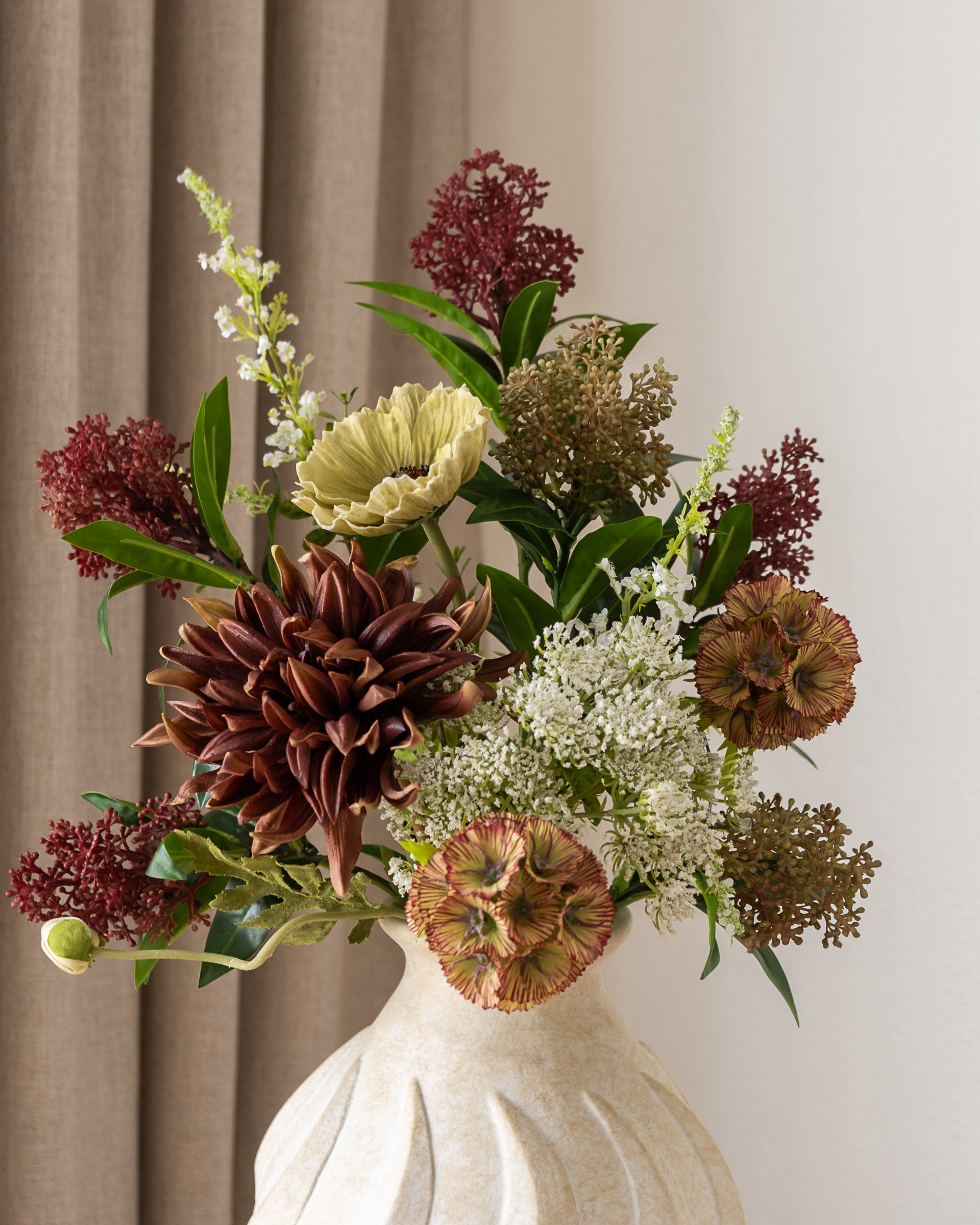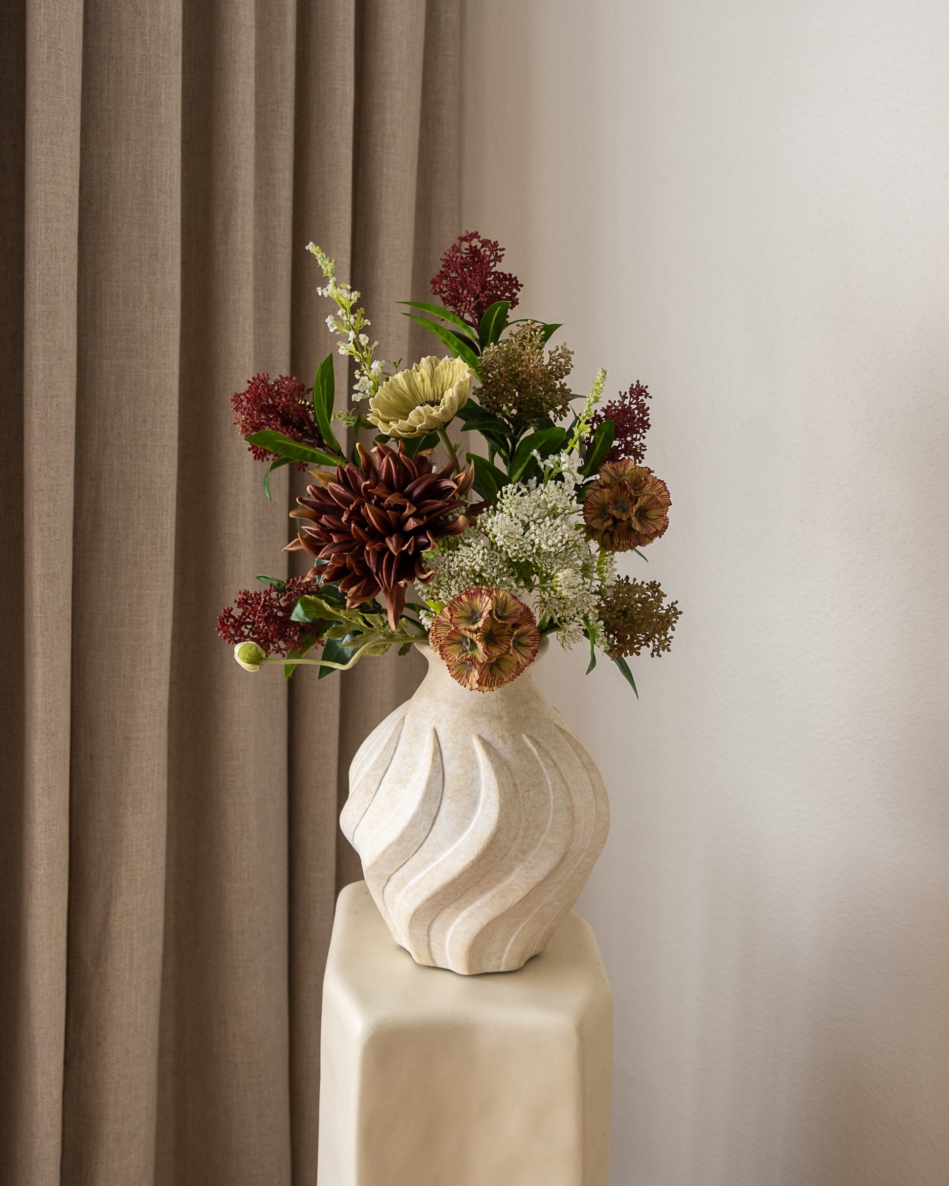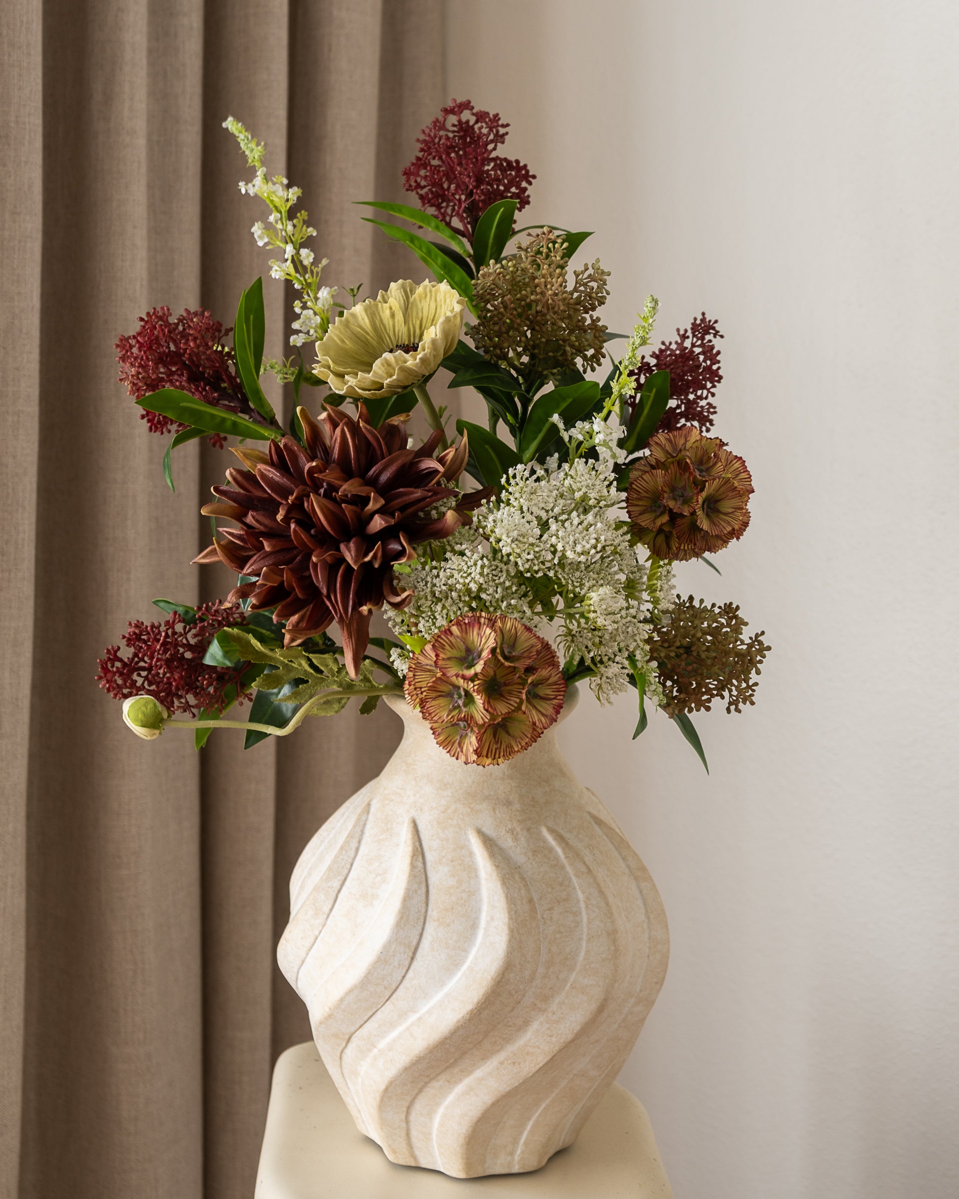 En varm kunstig høstbukett i brune og jordnære toner, balansert med lyse detaljer. Naturtro blomster som gir en rustikk, moderne høstfølelse.
