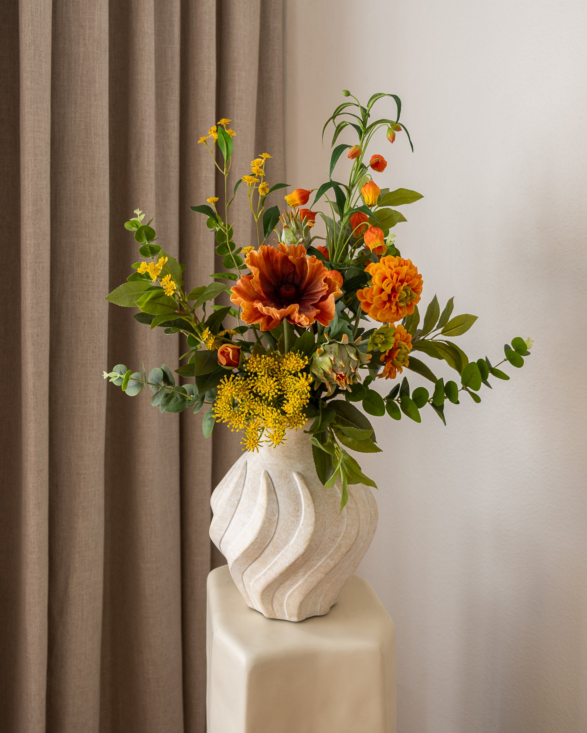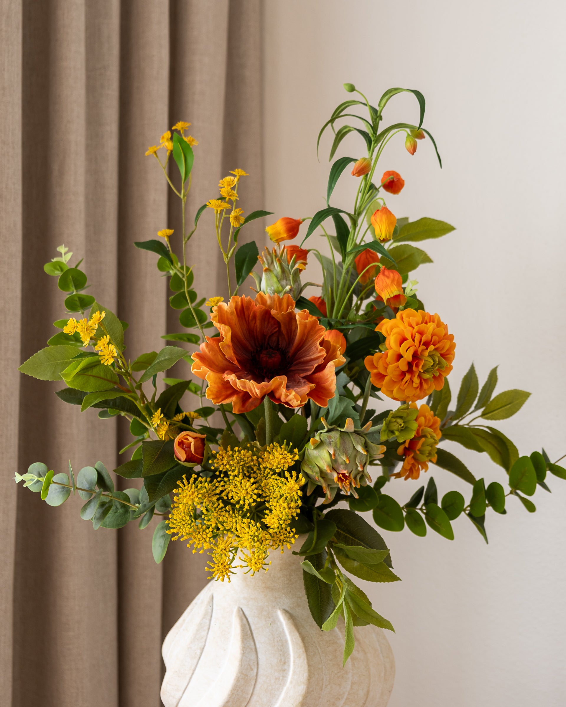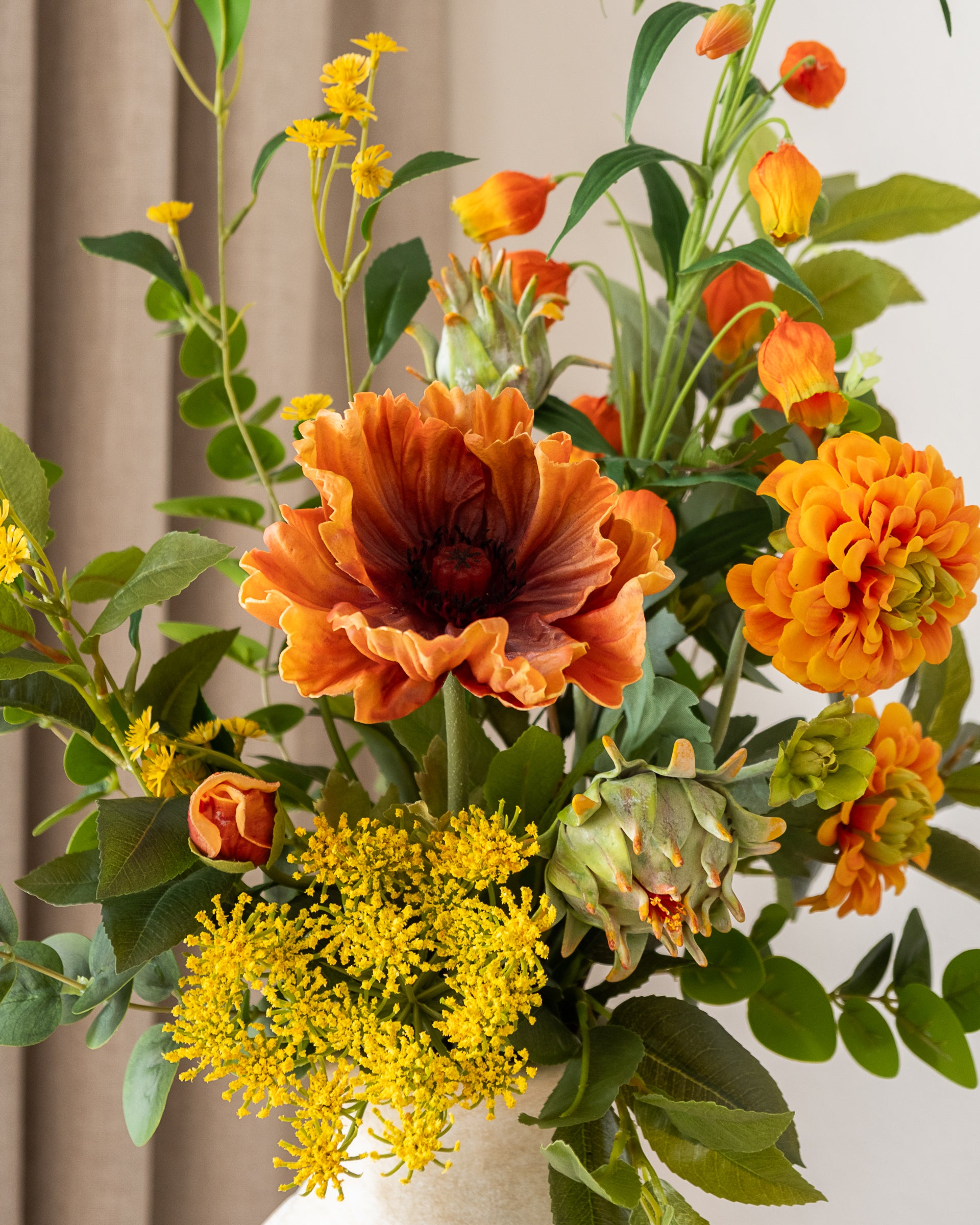 En rik kunstig høstbukett i oransje, gule og grønne toner. Realistiske blomster som hyller innhøstingen og gir en varm, innbydende atmosfære.