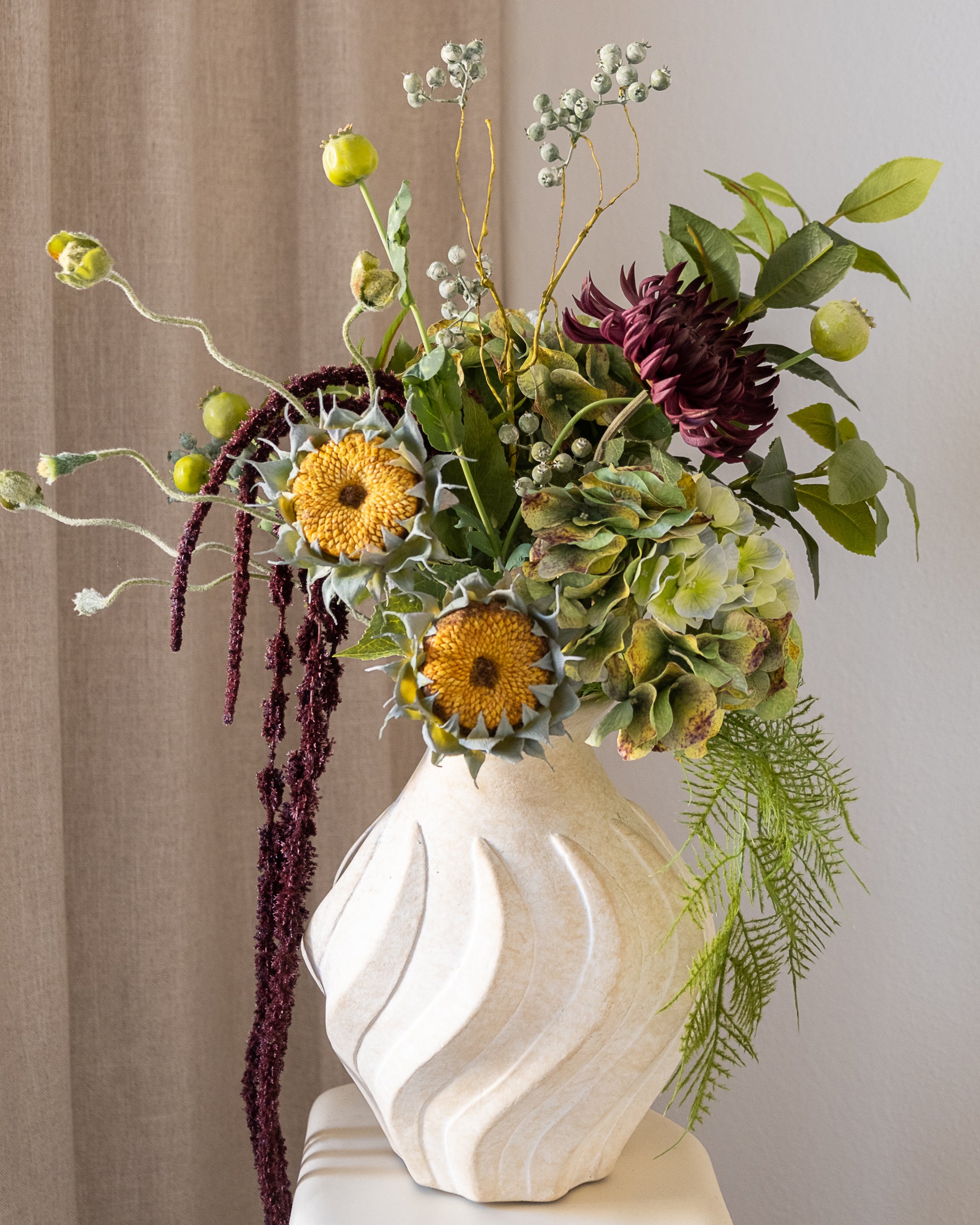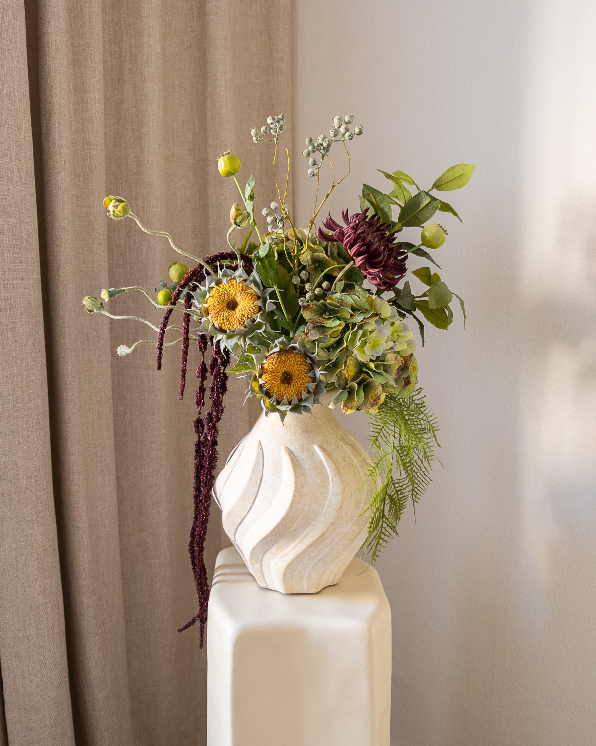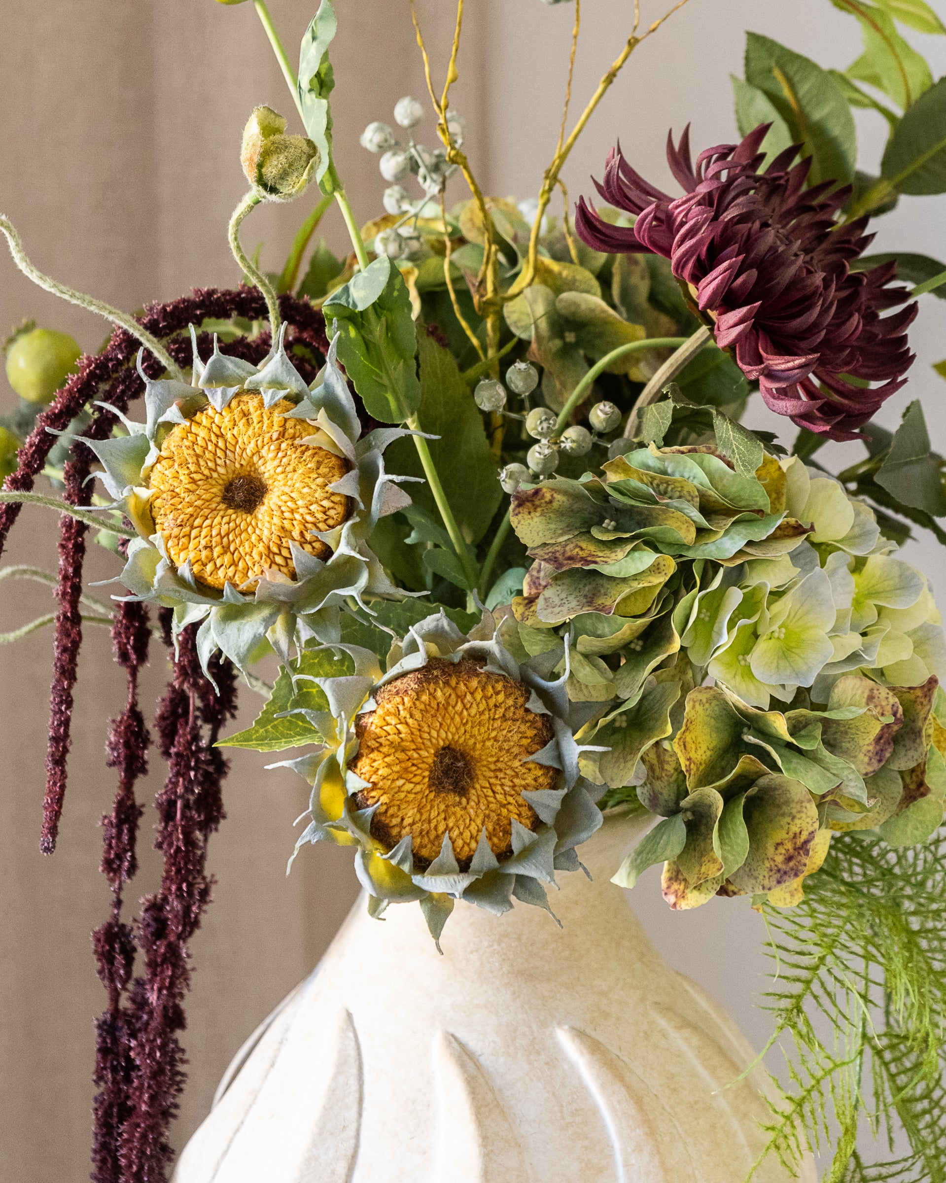 Buketten kan brukes alene for et varmt uttrykk, eller kombineres med flere buketter for å skape ekstra volum. Stilkene kan både klippes og bøyes, noe som gjør den fleksibel og enkel å style.