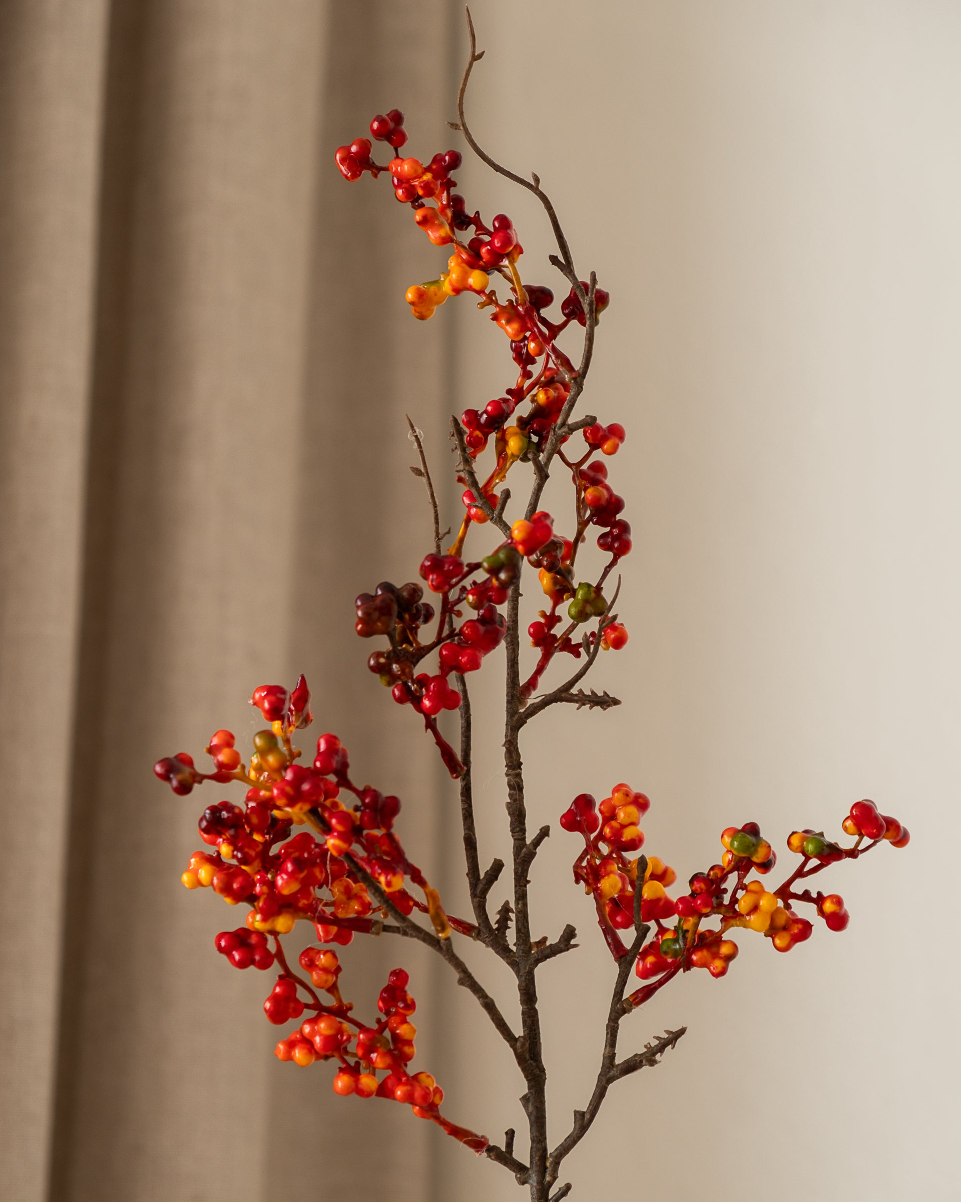 Berry Branch Small har en kompakt og uttrykksfull form med naturtro røde bær som tilfører farge og tekstur til enhver dekorasjon. Den tette forgreningen gir et harmonisk og balansert uttrykk, perfekt for mindre vaser eller som et fargerikt innslag i buketter og oppsatser.